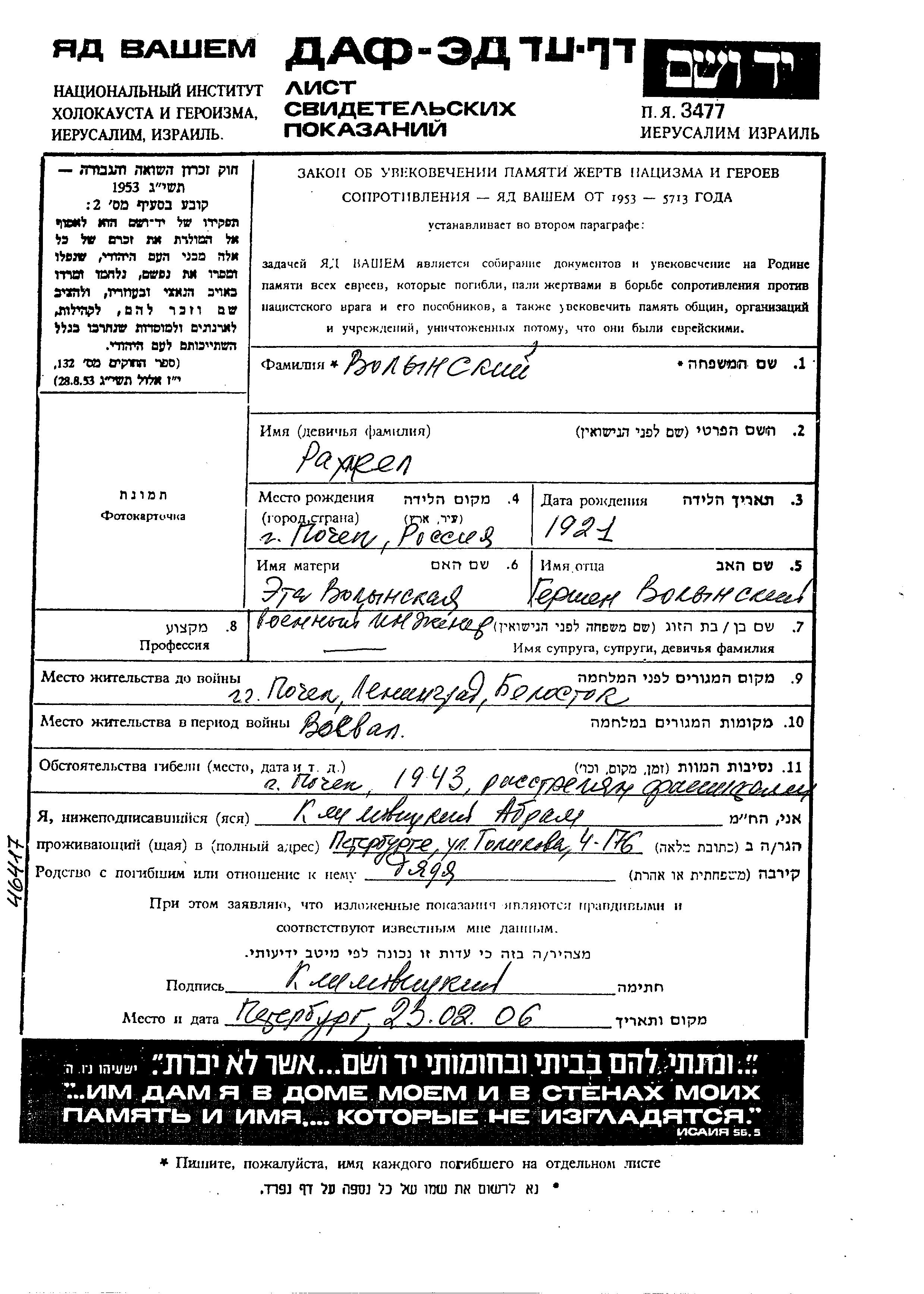 Rakhel Volynski wurde im Jahr 1921 in Pochep, Russland (UdSSR) geboren. Sie war die Tochter von Gershen und Eta. Sie war Ingenieur und Ledig. Vor dem Zweiten Weltkrieg lebte sie in Pochep, Russland (UdSSR). Während des Krieges war sie in die Sowjetischen Streitkräfte.