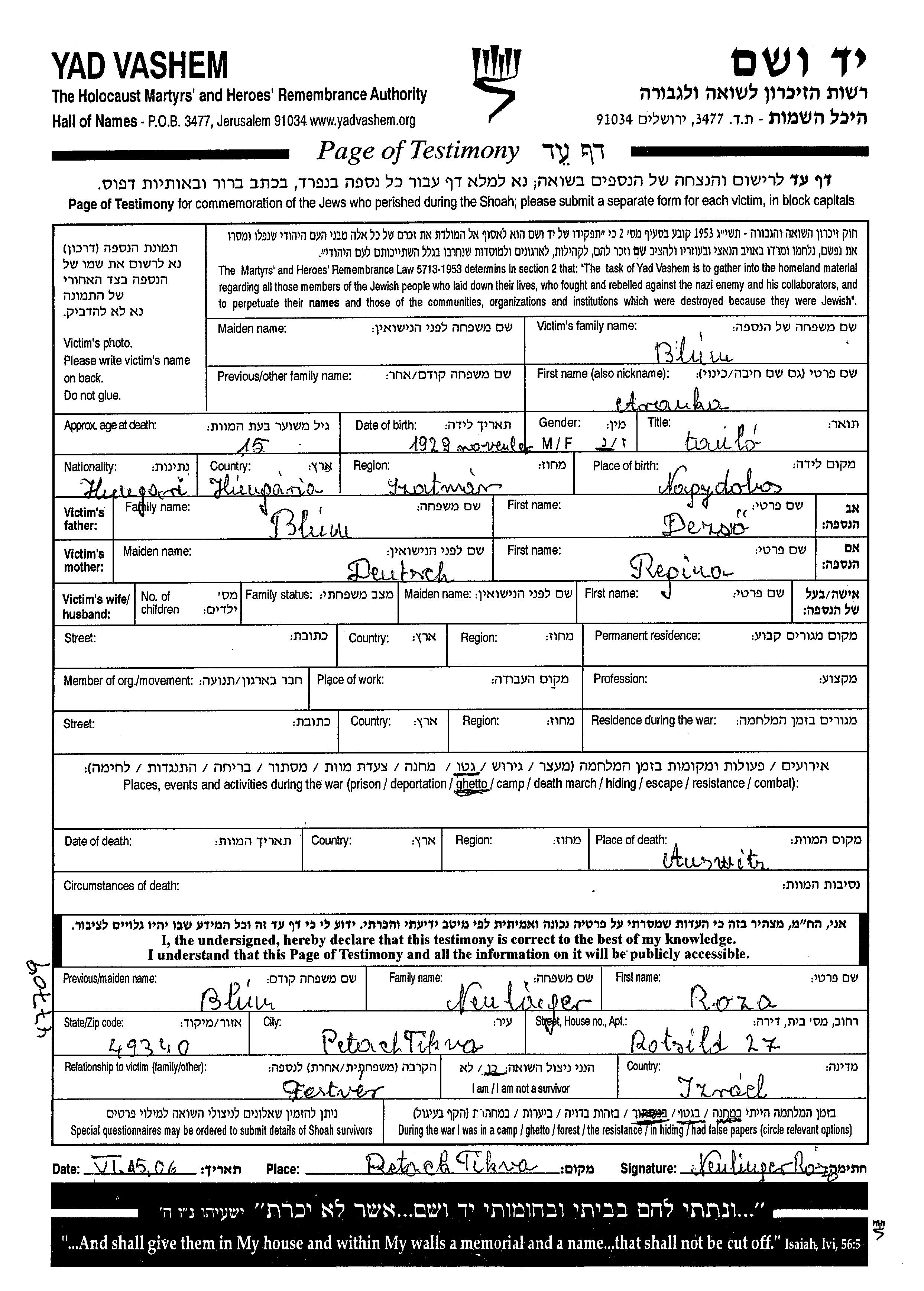 Aranka wurde in der Schoah ermordet. Todesort: Auschwitz, Polen.