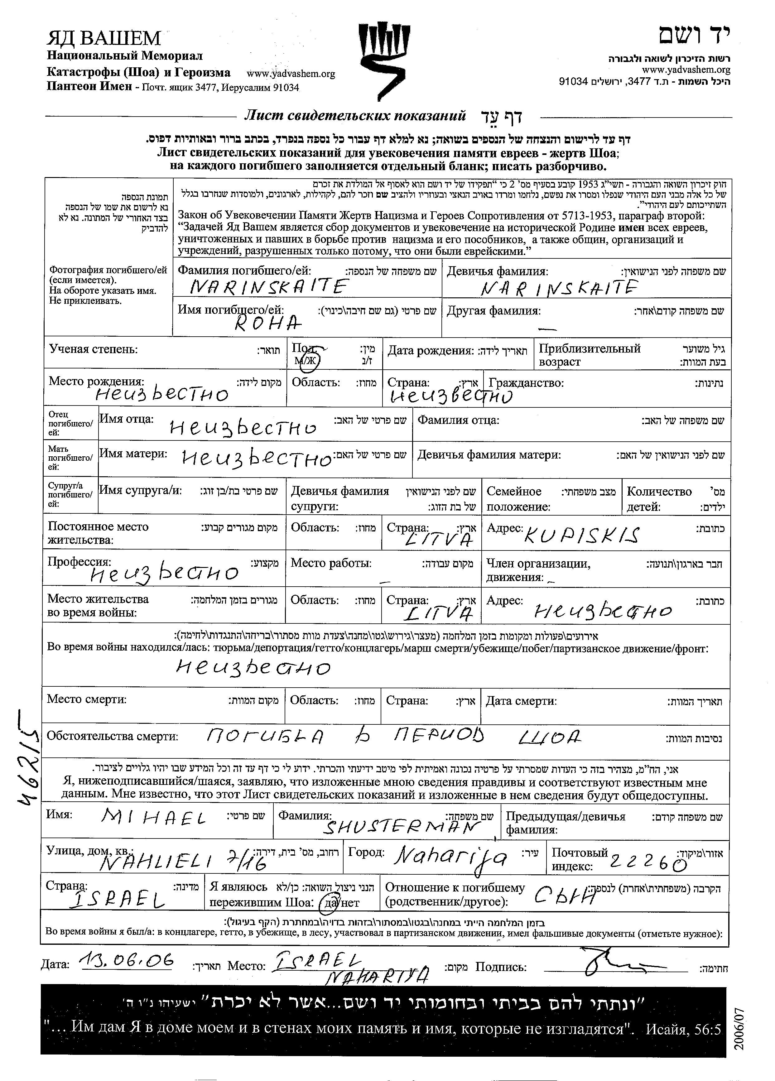 Roha Narinskaite. Sie war Ledig. Vor dem Zweiten Weltkrieg lebte sie in Kupiskis, Litauen. Während des Krieges war sie in Litauen.