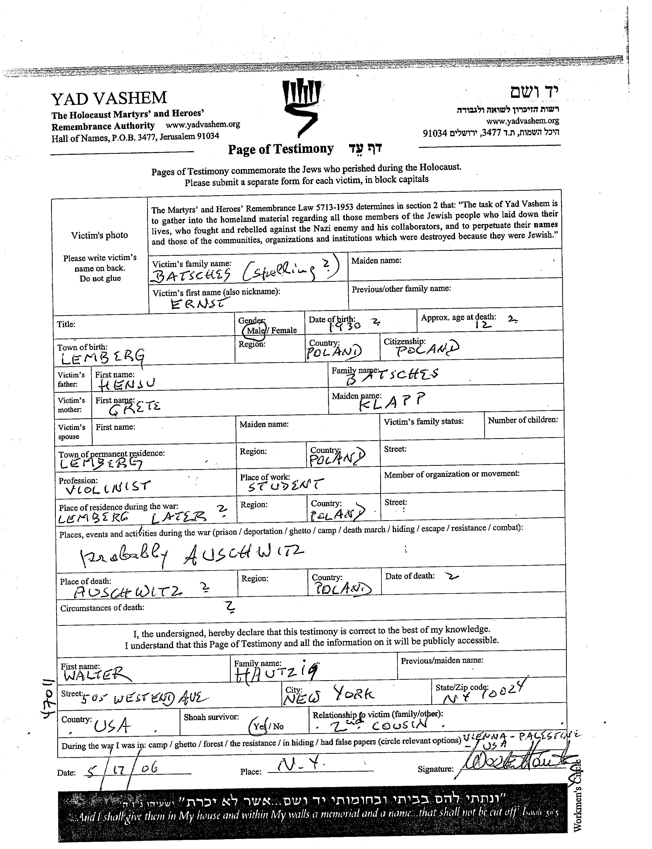 Ernst Batsches wurde im Jahr 1930 in Lemberg, Polen geboren. Er war der Sohn von Henju und Grete, geb. Klapp. Er war Musikstudent und Kind. Vor dem Zweiten Weltkrieg lebte er in Lemberg, Polen. Während des Krieges war er in Lemberg, Polen.