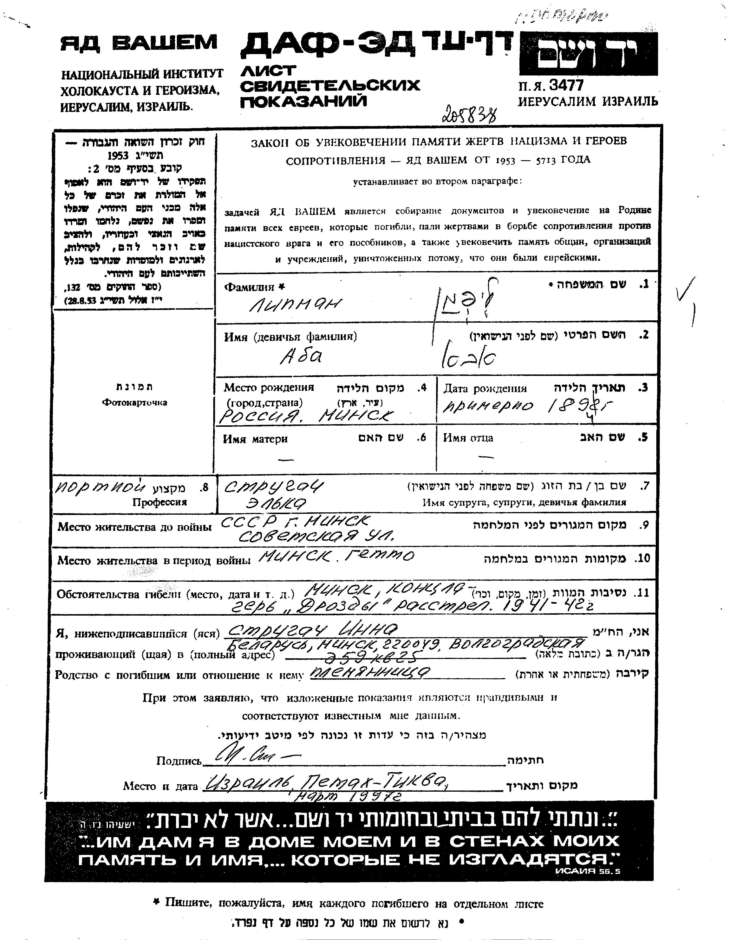 Aba Lipman wurde im Jahr 1894 in Minsk, Weißrussland (UdSSR) geboren. Er war Schneider und mit Elka, geb. Strugach Verheiratet. Vor dem Zweiten Weltkrieg lebte er in Minsk, Weißrussland (UdSSR). Während des Krieges war er in Minsk, Weißrussland (UdSSR).