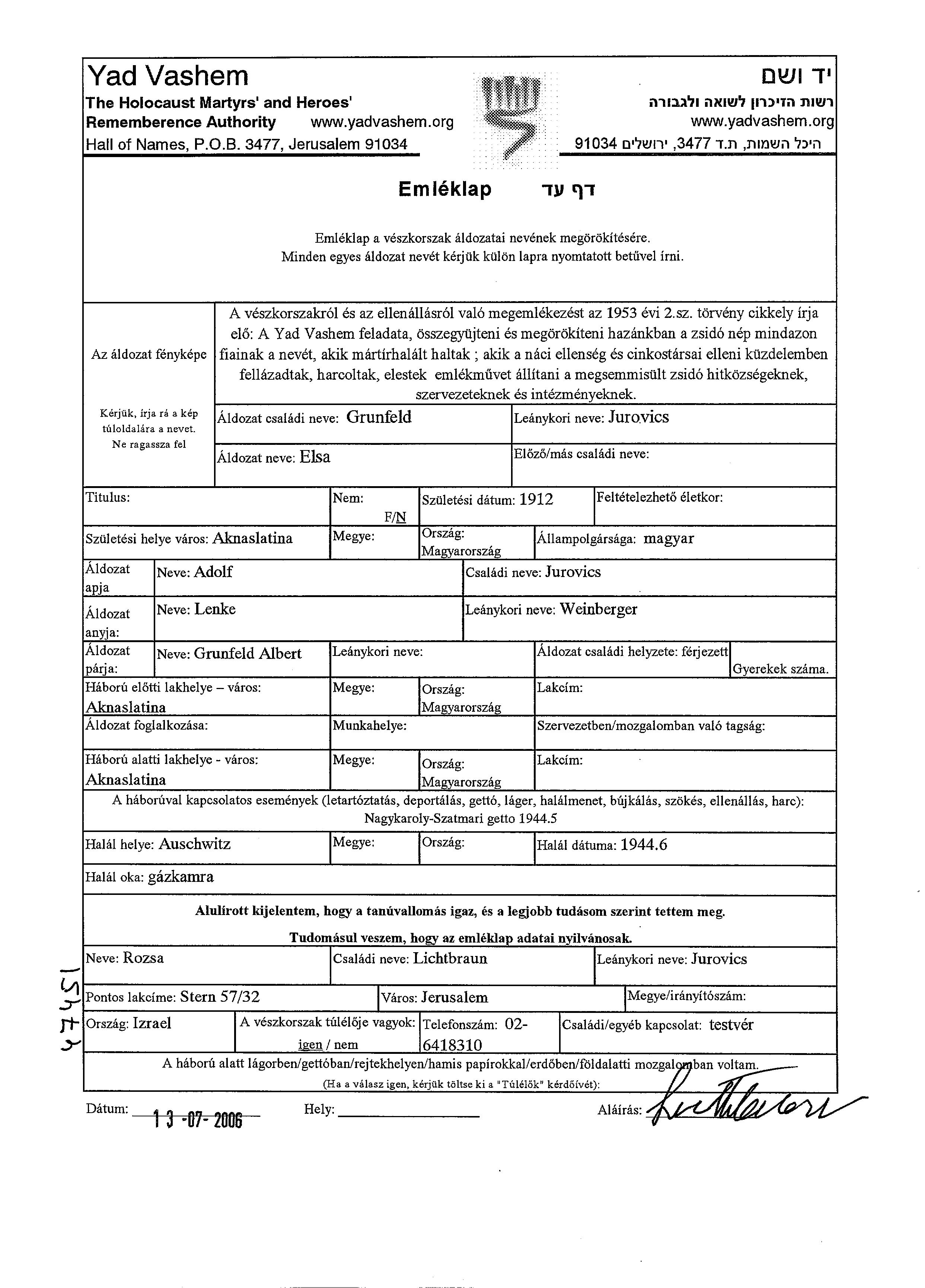 Elsa Grunfeld, geb. Jurovics wurde im Jahr 1912 in Akna Szlatina, Tschechoslowakei geboren. Sie war die Tochter von Adolf und Lenke, geb. Weinberger. Sie war mit Albert Verheiratet. Vor dem Zweiten Weltkrieg lebte sie in Akna Szlatina, Tschechoslowakei. Während des Krieges war sie in Akna Szlatina, Tschechoslowakei.