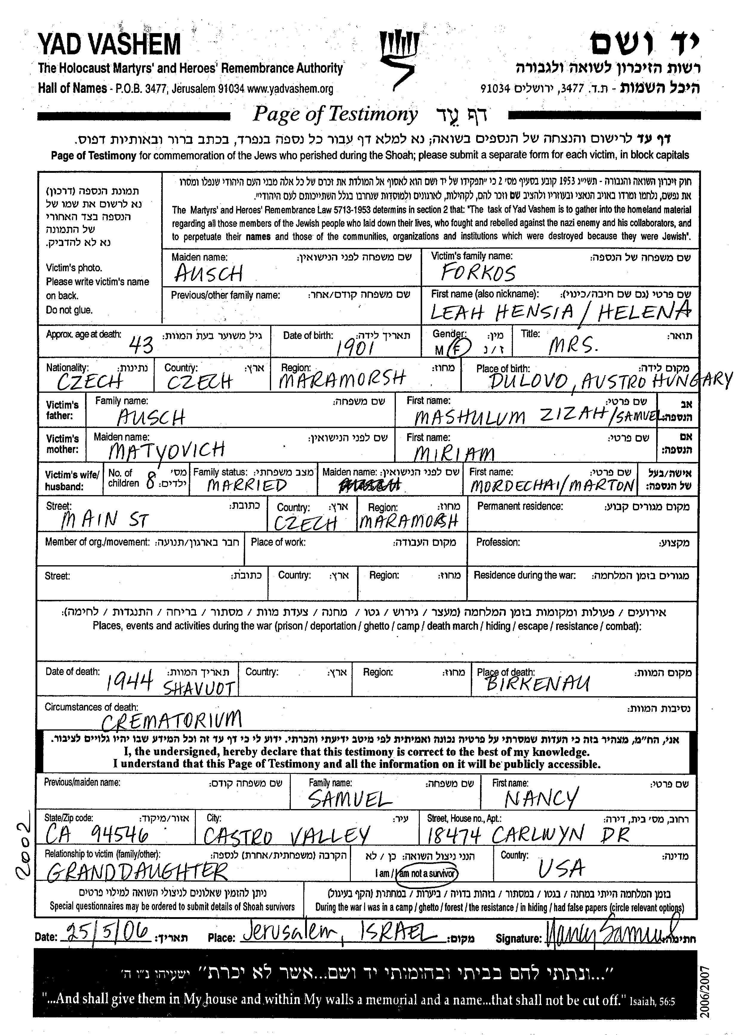 Hensia Leah Helena Forkos, geb. Ausch wurde im Jahr 1901 in Dulovo, Tschechoslowakei geboren. Sie war die Tochter von Samuel Zizah Mashulum und Miriam, geb. Matyovich. Sie war mit Mordechai Marton Verheiratet. Vor dem Zweiten Weltkrieg lebte sie in Maramarosz, Rumänien.