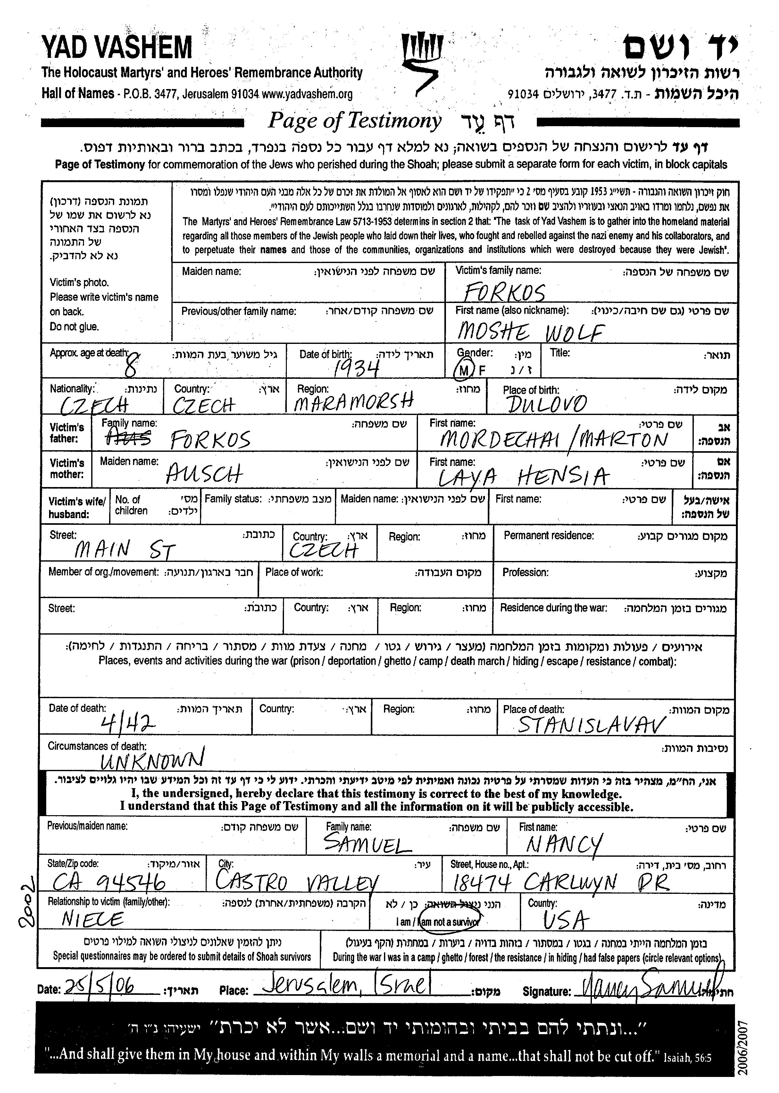 Moshe Wolf Forkos wurde im Jahr 1934 in Dulovo, Tschechoslowakei geboren. Er war der Sohn von Mordechai Marton und Hensia Laya, geb. Ausch. Er war Kind. Vor dem Zweiten Weltkrieg lebte er in Tschechoslowakei.