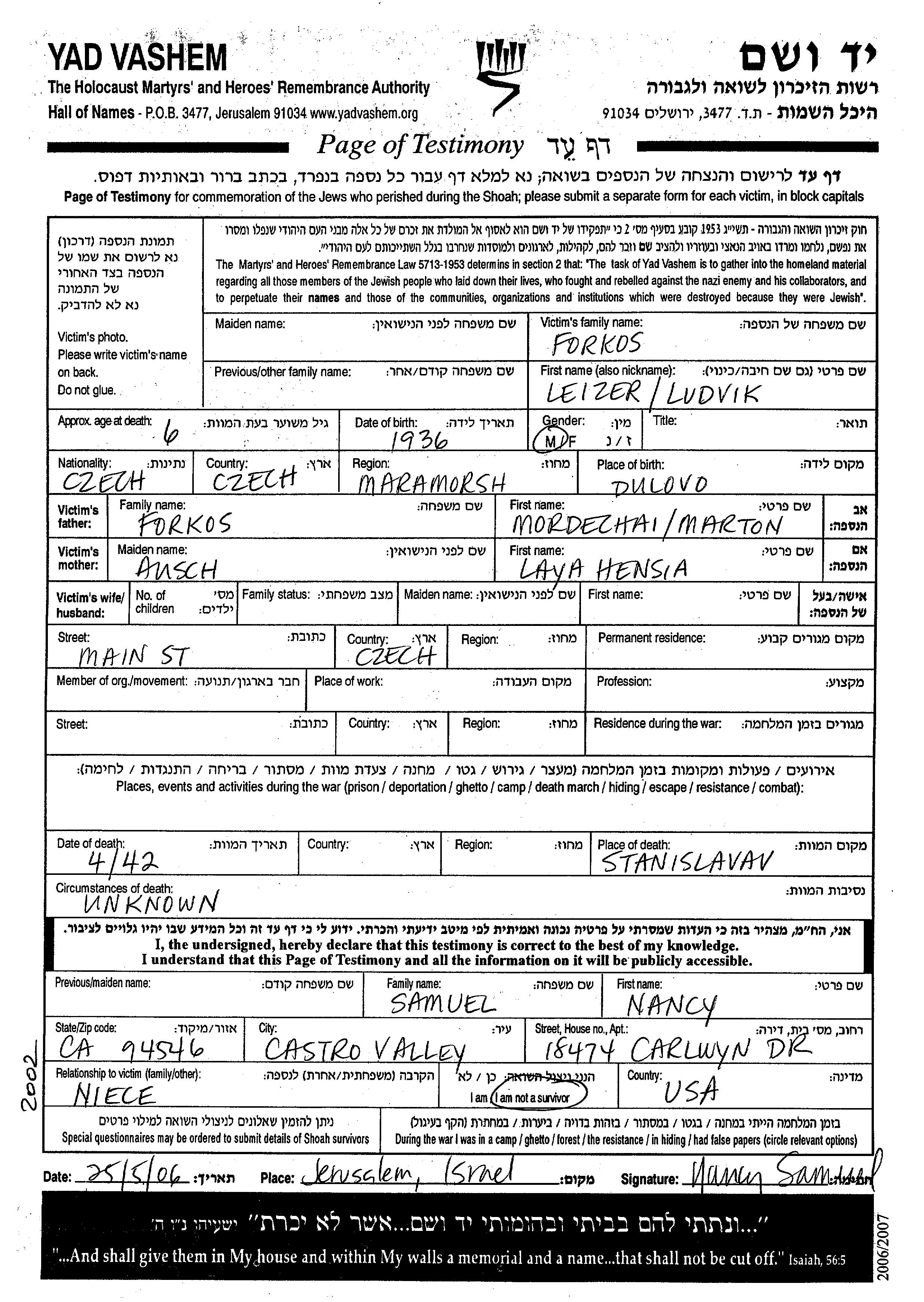 Ludvik Leizer Forkos wurde im Jahr 1936 in Dulovo, Tschechoslowakei geboren. Er war der Sohn von Marton Mordechai und Laya Hensia, geb. Ausch. Er war Kind. Vor dem Zweiten Weltkrieg lebte er in Tschechoslowakei.