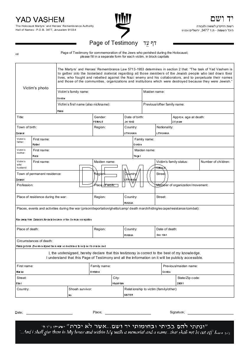 Rivka Gordon wurde in Zarasai, Litauen geboren. Sie war die Tochter von Rafael und Roza, geb. Treger. Vor dem Zweiten Weltkrieg lebte sie in Zarasai, Litauen. Während des Krieges war sie in Zarasai, Litauen.