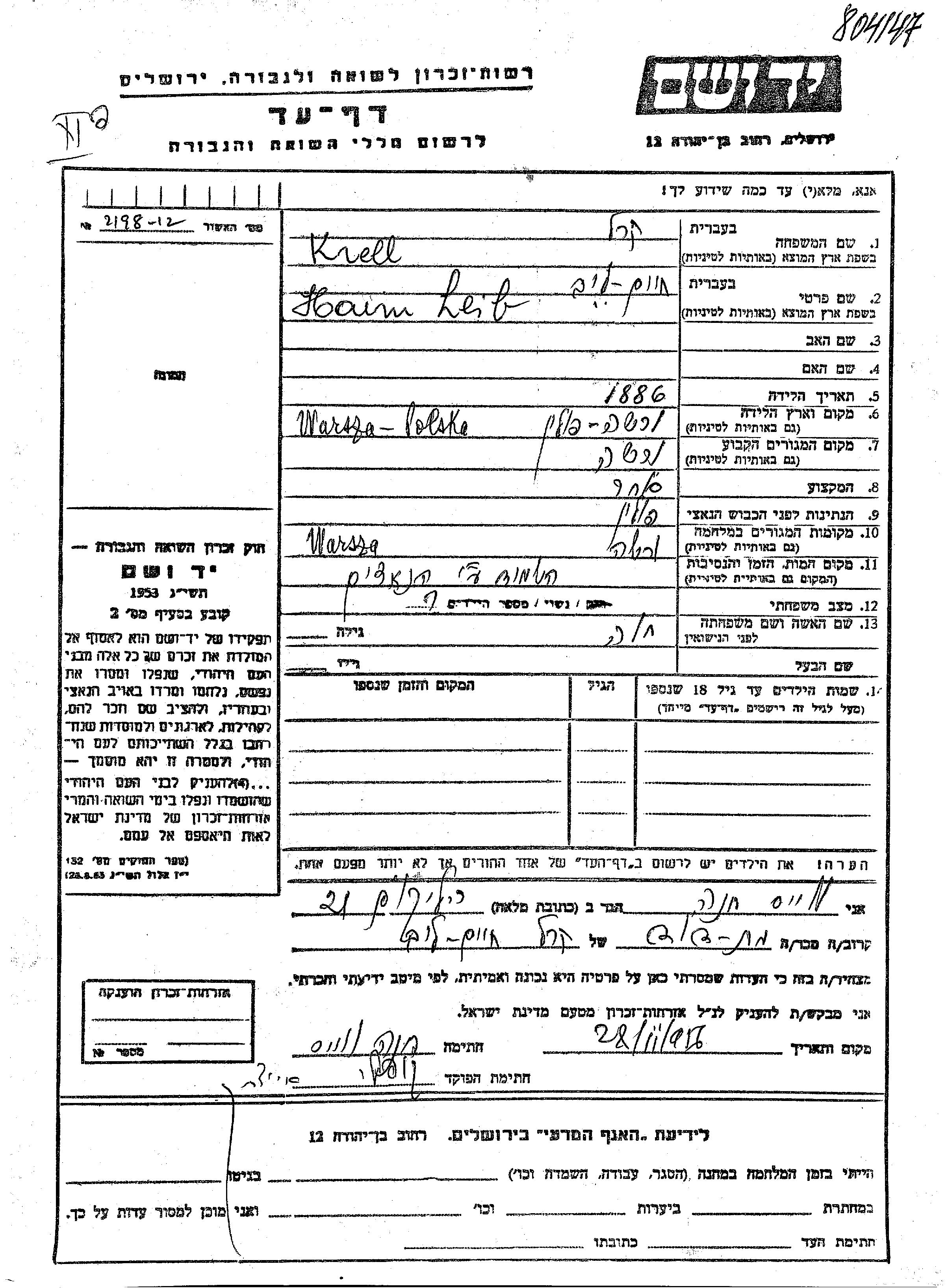Haim Leib Krell Kral wurde im Jahr 1886 in Warsaw, Polen geboren. Er war Kaufmann/-frau und mit Khava Verheiratet. Vor dem Zweiten Weltkrieg lebte er in Warsaw, Polen. Während des Krieges war er in Warsaw, Polen.