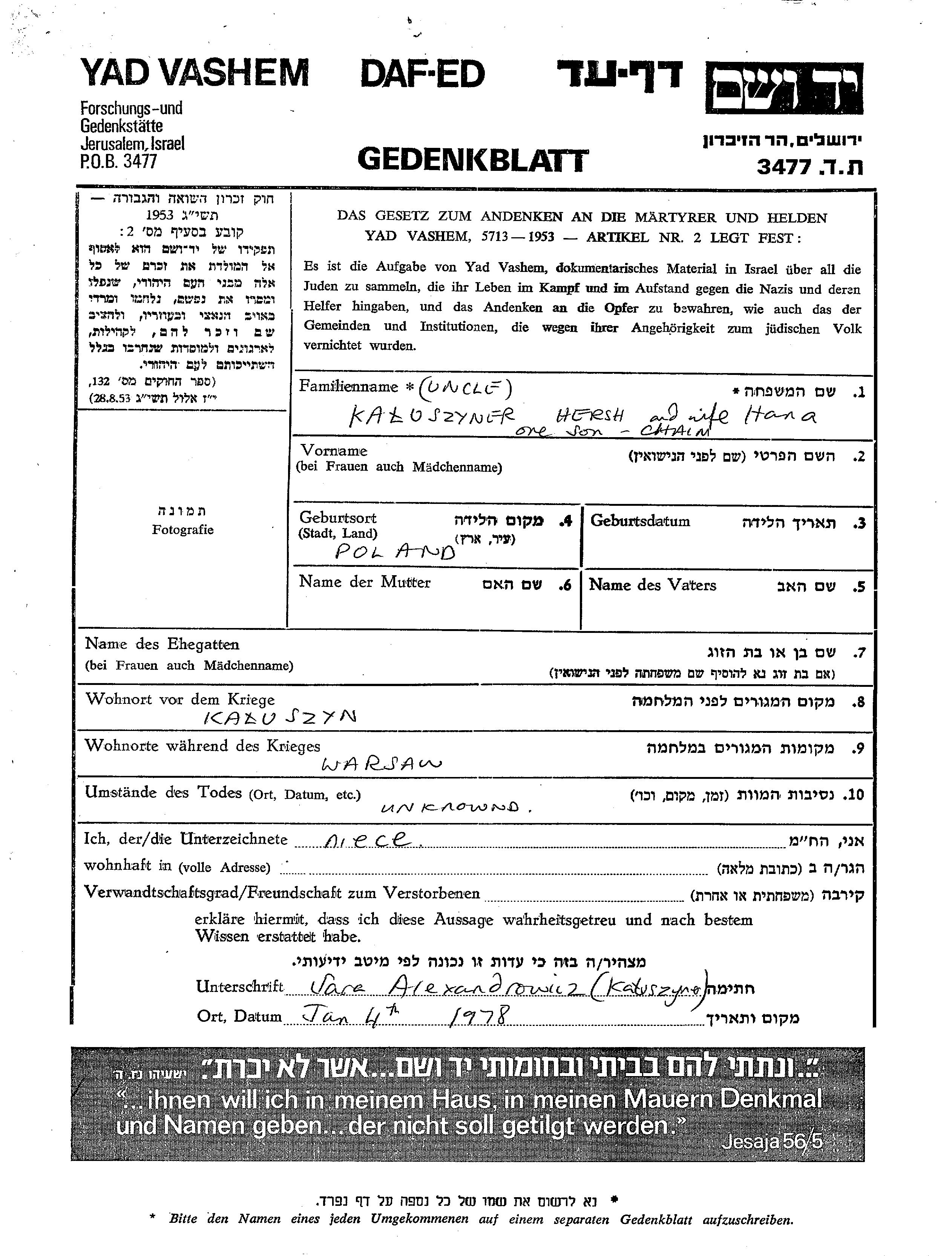 Kaloszyner Hersh Kaluszyn, Polen Gedenkblatt