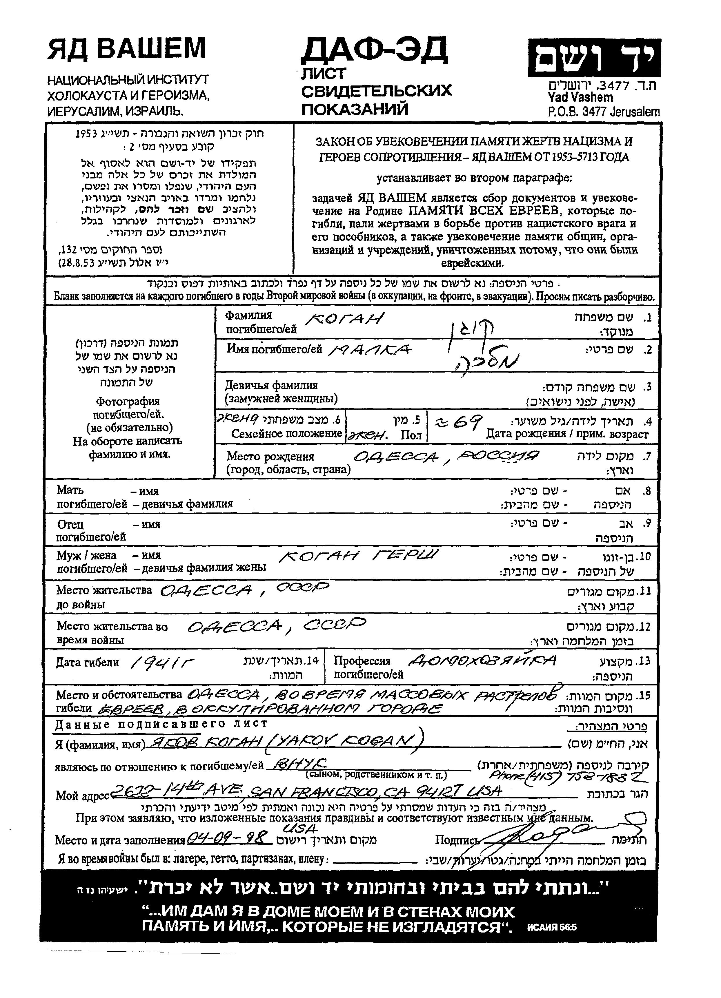 Malka Kogan wurde in Odessa, Ukraine (UdSSR) geboren. Sie war Hausfrau und mit Gersh Verheiratet. Vor dem Zweiten Weltkrieg lebte sie in Odessa, Ukraine (UdSSR). Während des Krieges war sie in Odessa, Ukraine (UdSSR).