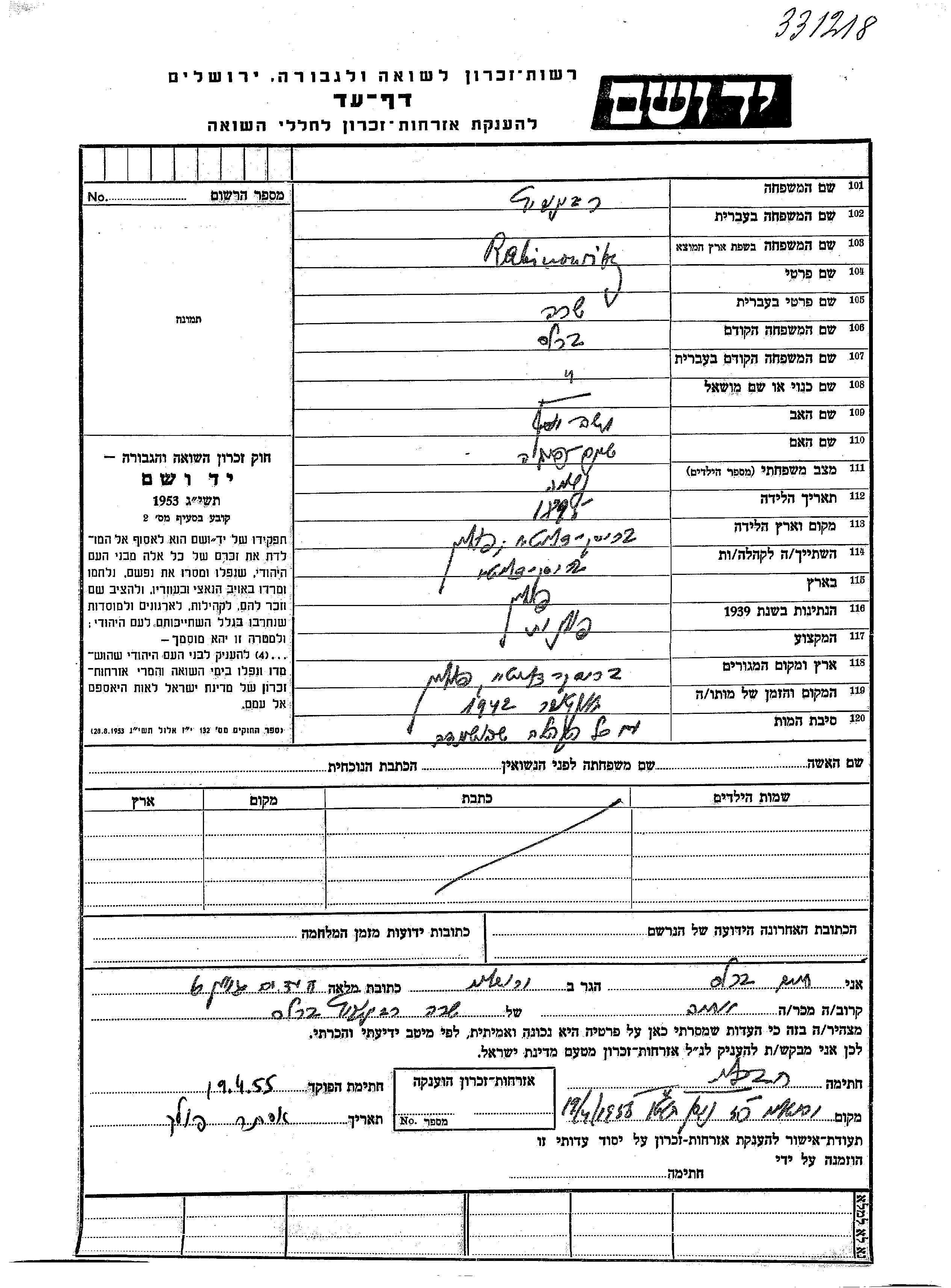 Rabinowitz Sara 1898 Brest, Polen Gedenkblatt