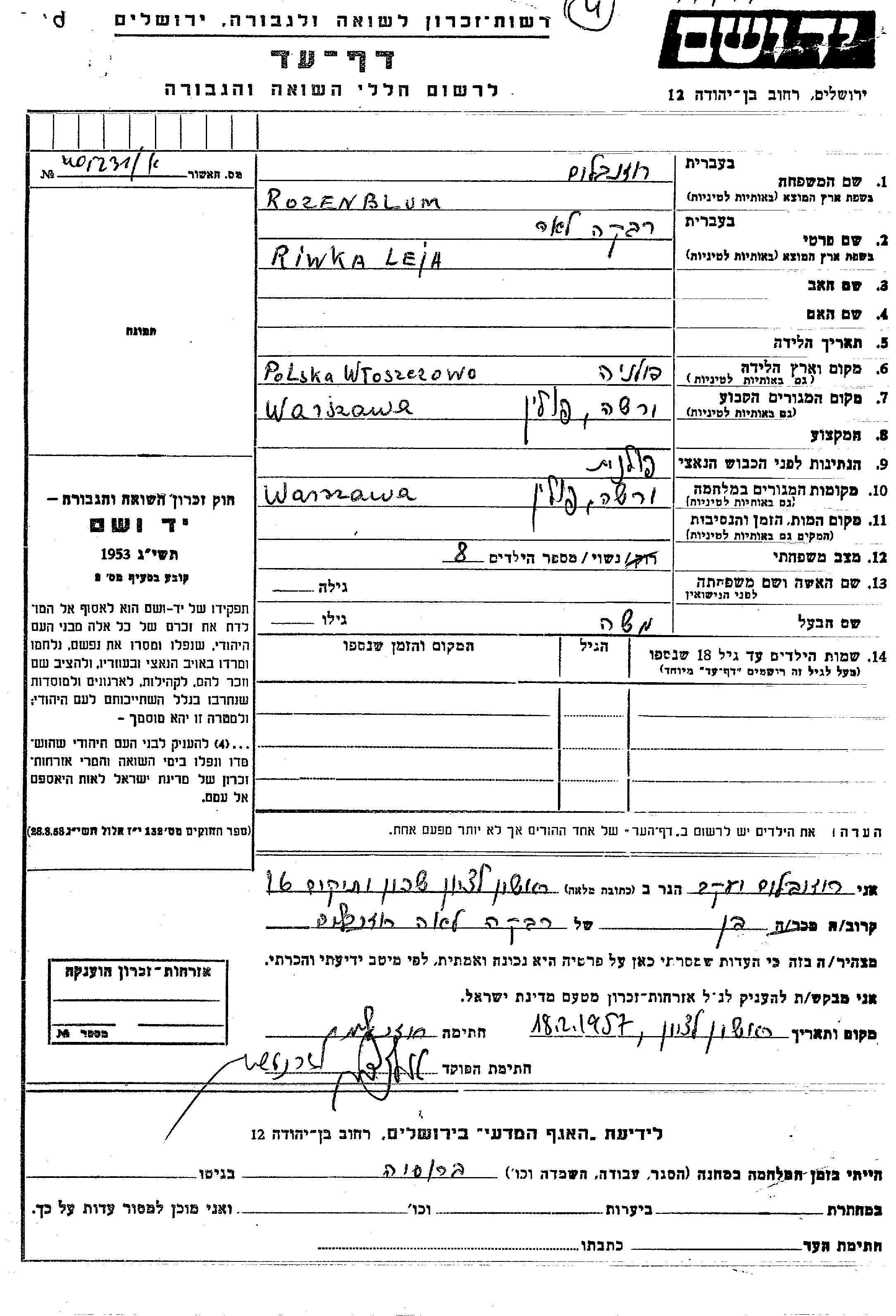 Riwka Leja Rozenblum wurde in Wloszczowa, Polen geboren. Sie war mit Moshe Verheiratet. Vor dem Zweiten Weltkrieg lebte sie in Warsaw, Polen. Während des Krieges war sie in Warsaw, Polen.