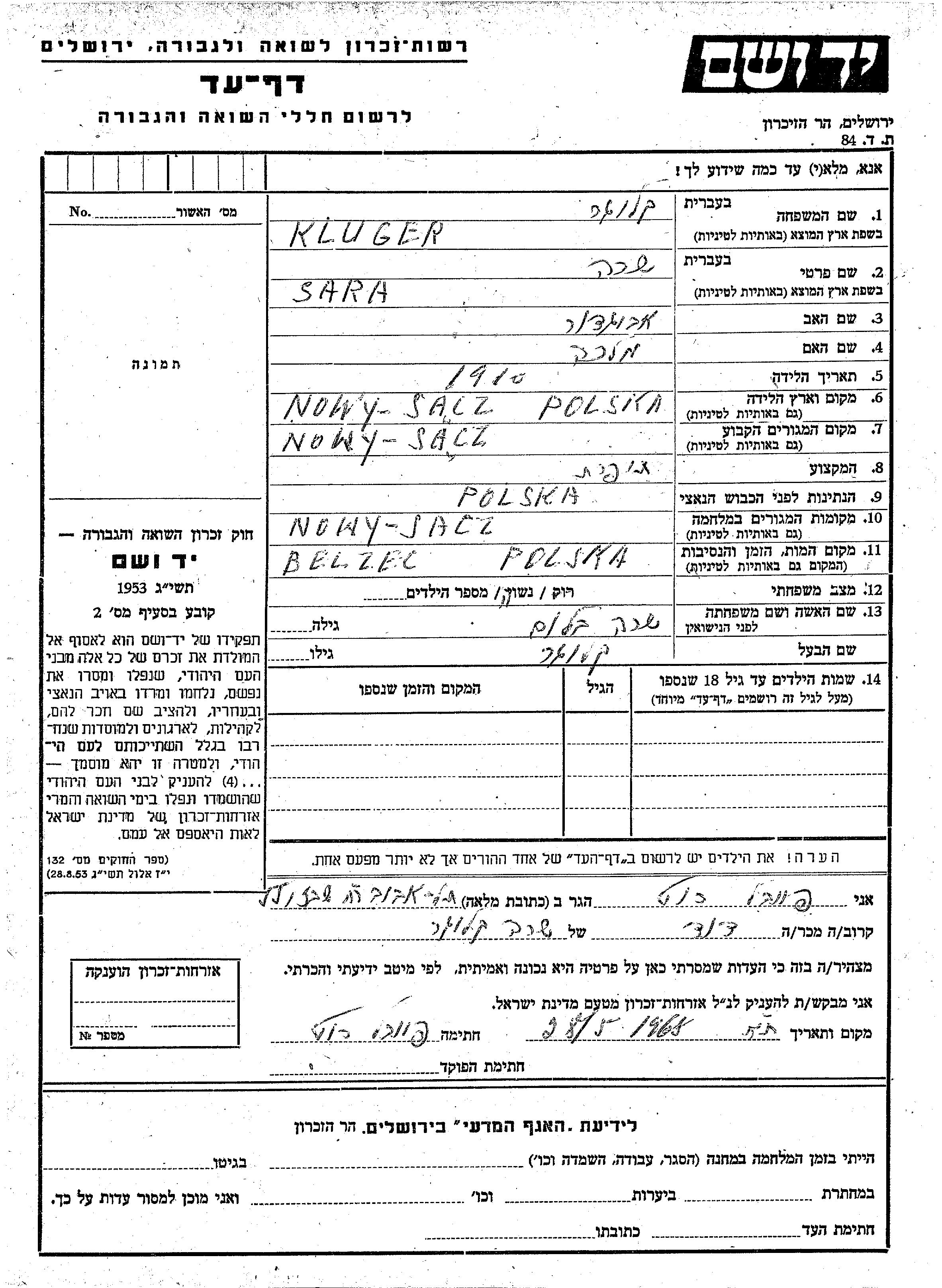 Sara Kluger, geb. Blum wurde im Jahr 1910 in Nowy Sacz, Polen geboren. Sie war die Tochter von Avigdor und Malka. Sie war Schneiderin und Verheiratet. Vor dem Zweiten Weltkrieg lebte sie in Nowy Sacz, Polen. Während des Krieges war sie in Nowy Sacz, Polen.
