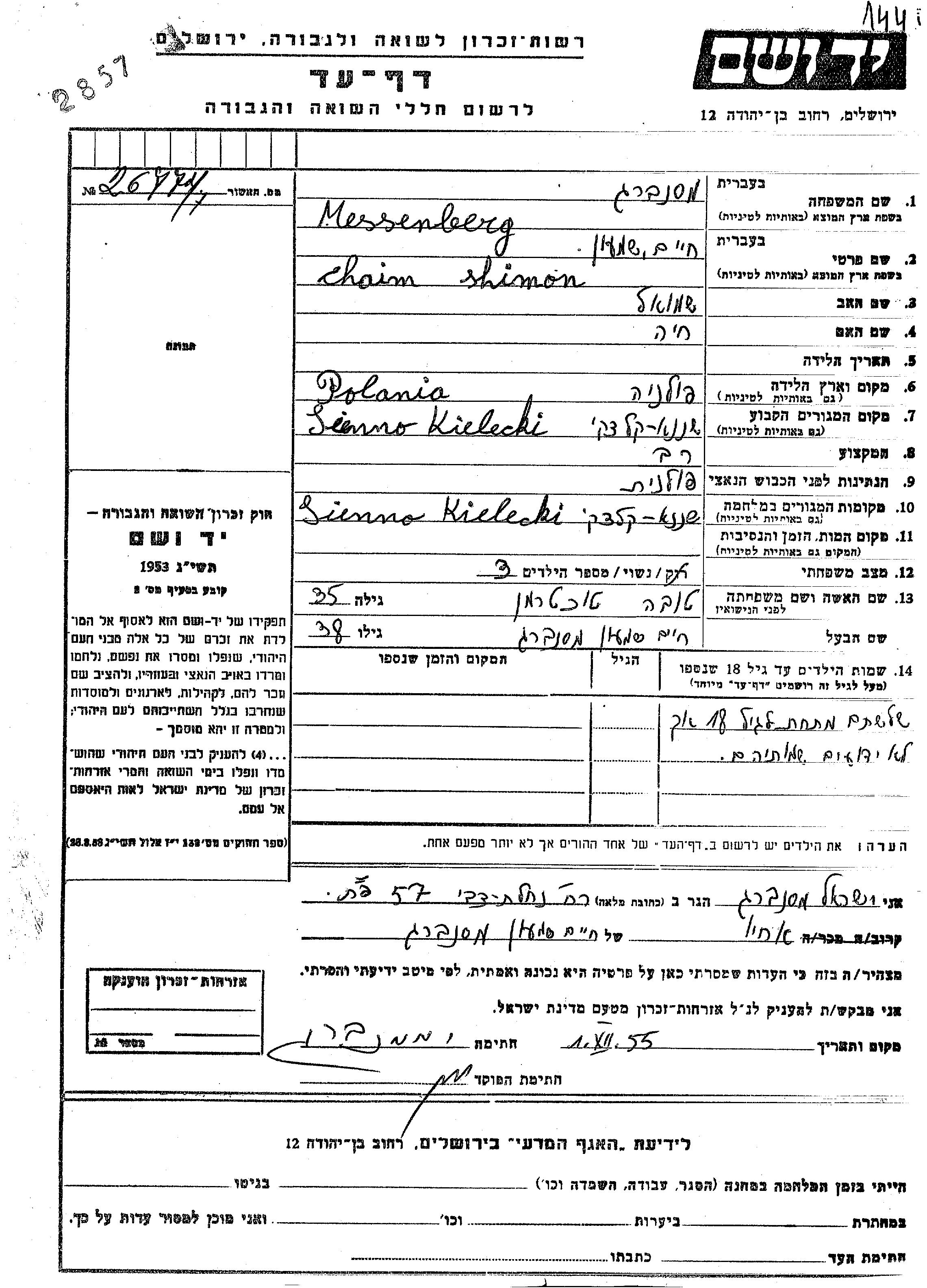 Messenberg Chaim Shimon Sienno, Polen Gedenkblatt