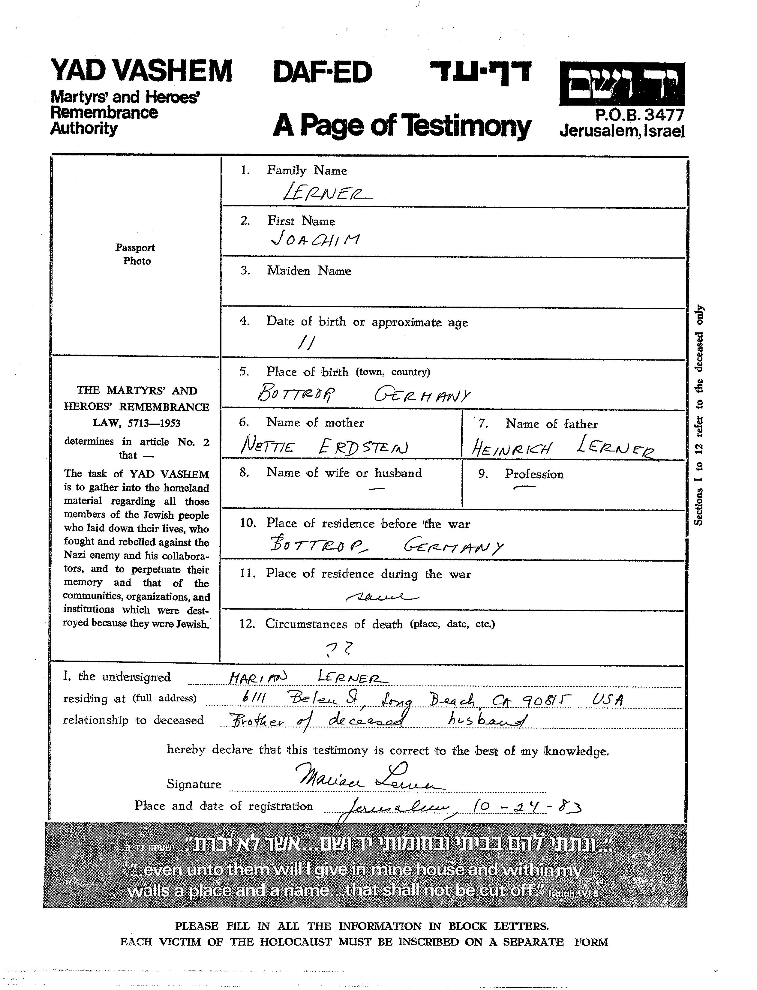 Joachim Lerner wurde in Bottrop, Deutsches Reich geboren. Er war der Sohn von Heinrich und Nettie. Vor dem Zweiten Weltkrieg lebte er in Bottrop, Deutsches Reich. Während des Krieges war er in Bottrop, Deutsches Reich.
