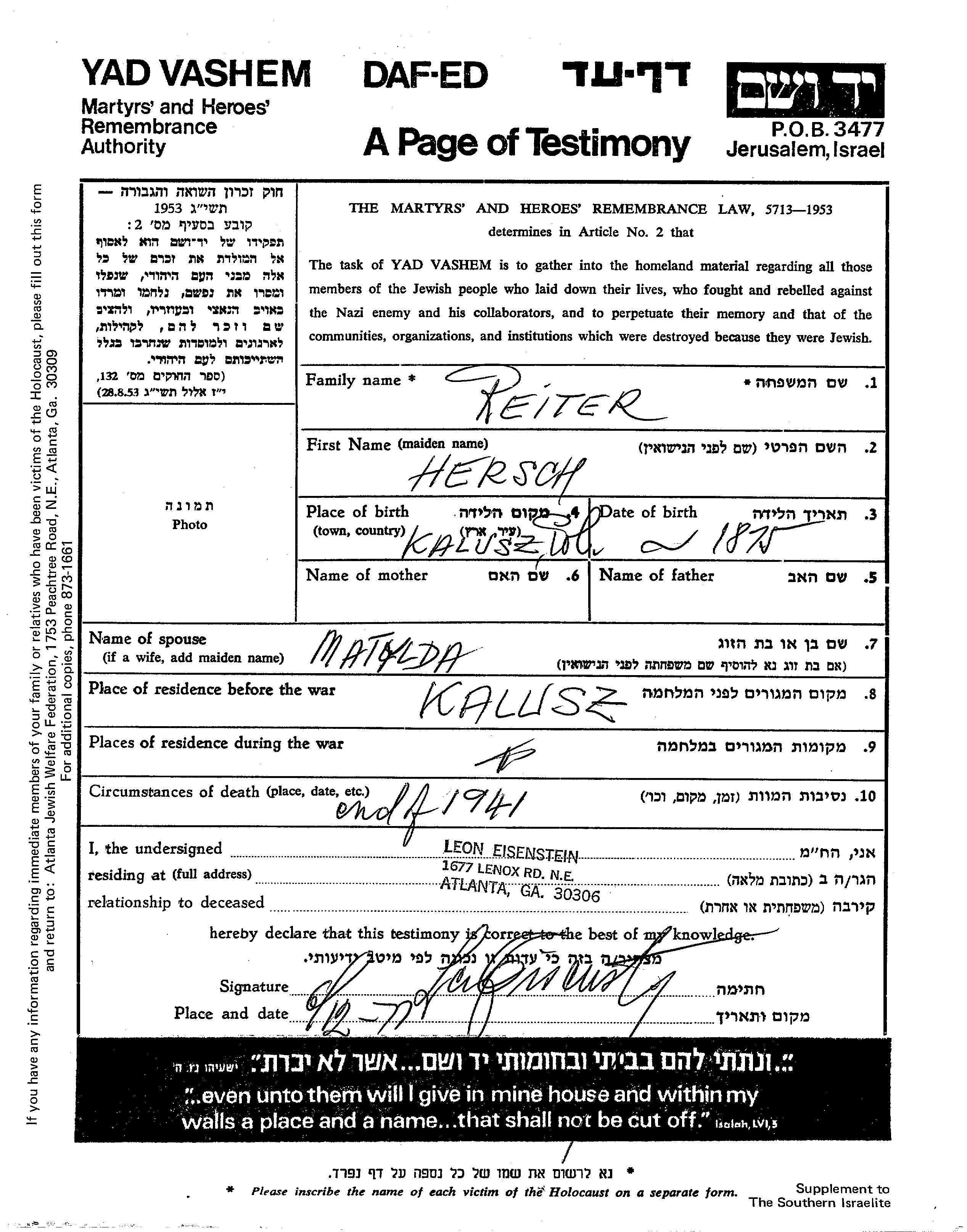 Hersch Reiter wurde im Jahr 1875 in Kalusz, Polen geboren. Er war mit Matylda Verheiratet. Vor dem Zweiten Weltkrieg lebte er in Kalusz, Polen. Während des Krieges war er in Kalusz, Polen.