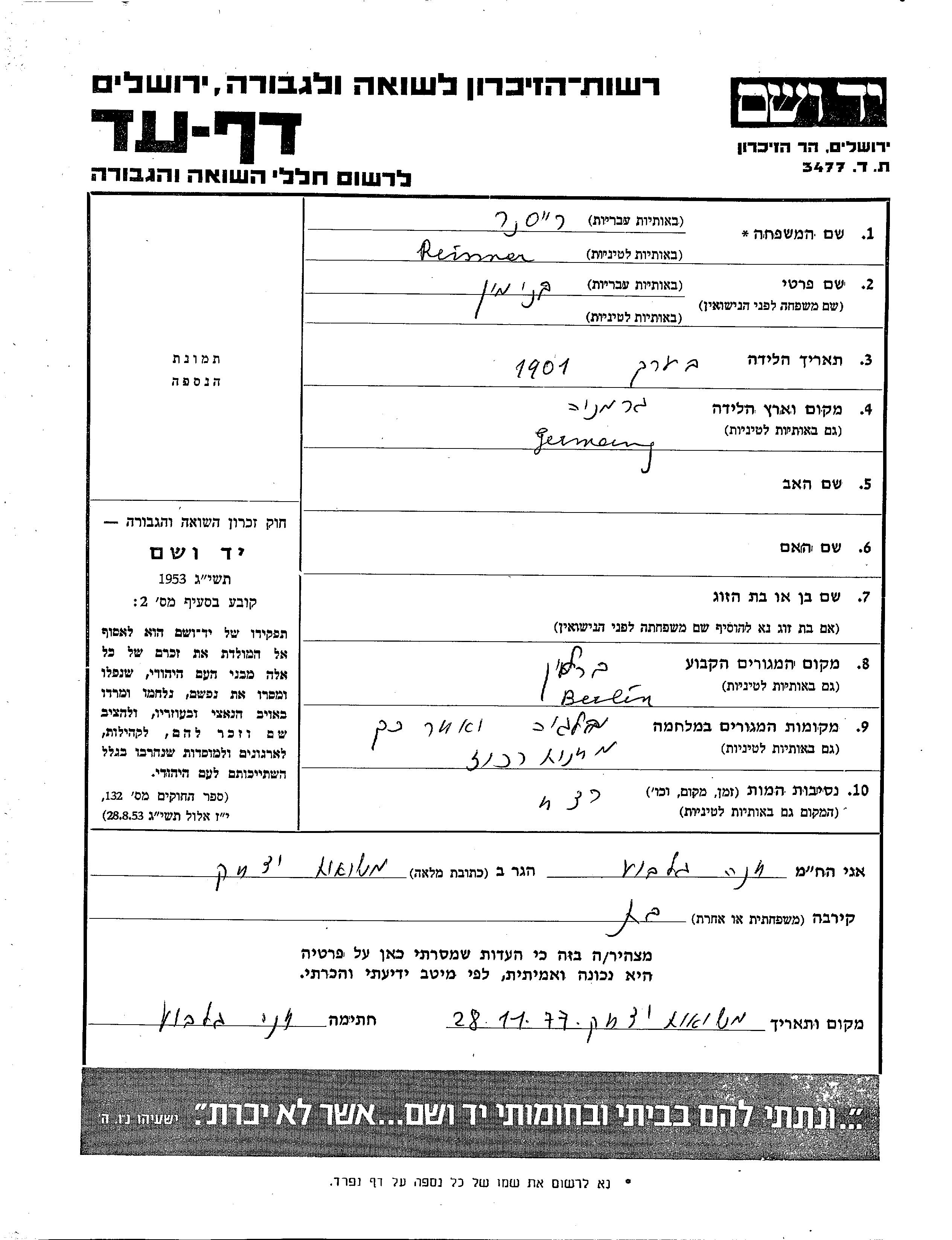 Reissner Beniamin 1901 Berlin, Deutsches Reich Gedenkblatt