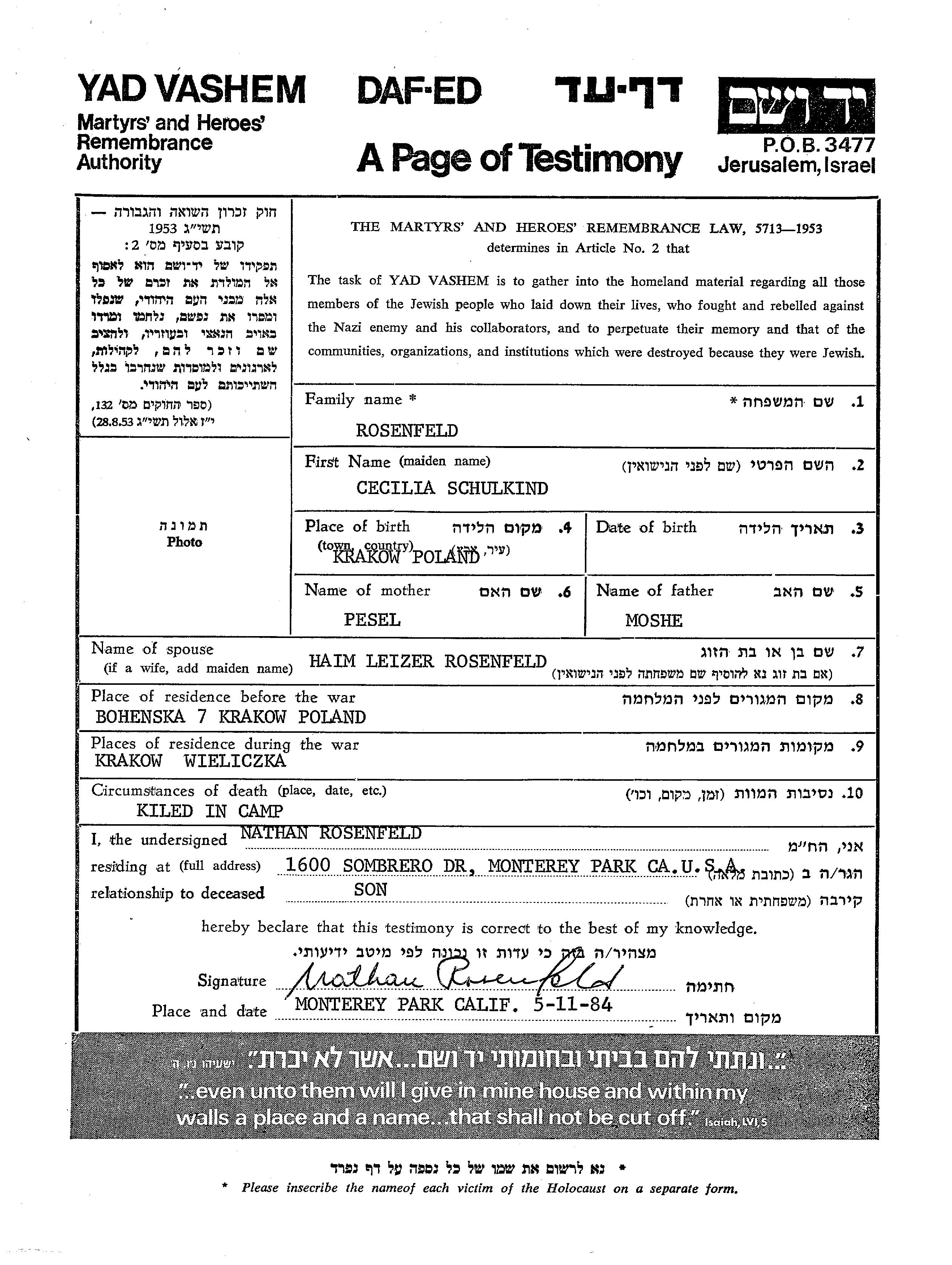 Cecilia Rosenfeld, geb. Schulkind wurde in Krakow, Polen geboren. Sie war die Tochter von Moshe und Pesel. Sie war mit Haim Leizer Verheiratet. Vor dem Zweiten Weltkrieg lebte sie in Krakow, Polen. Während des Krieges war sie in Krakow, Polen.