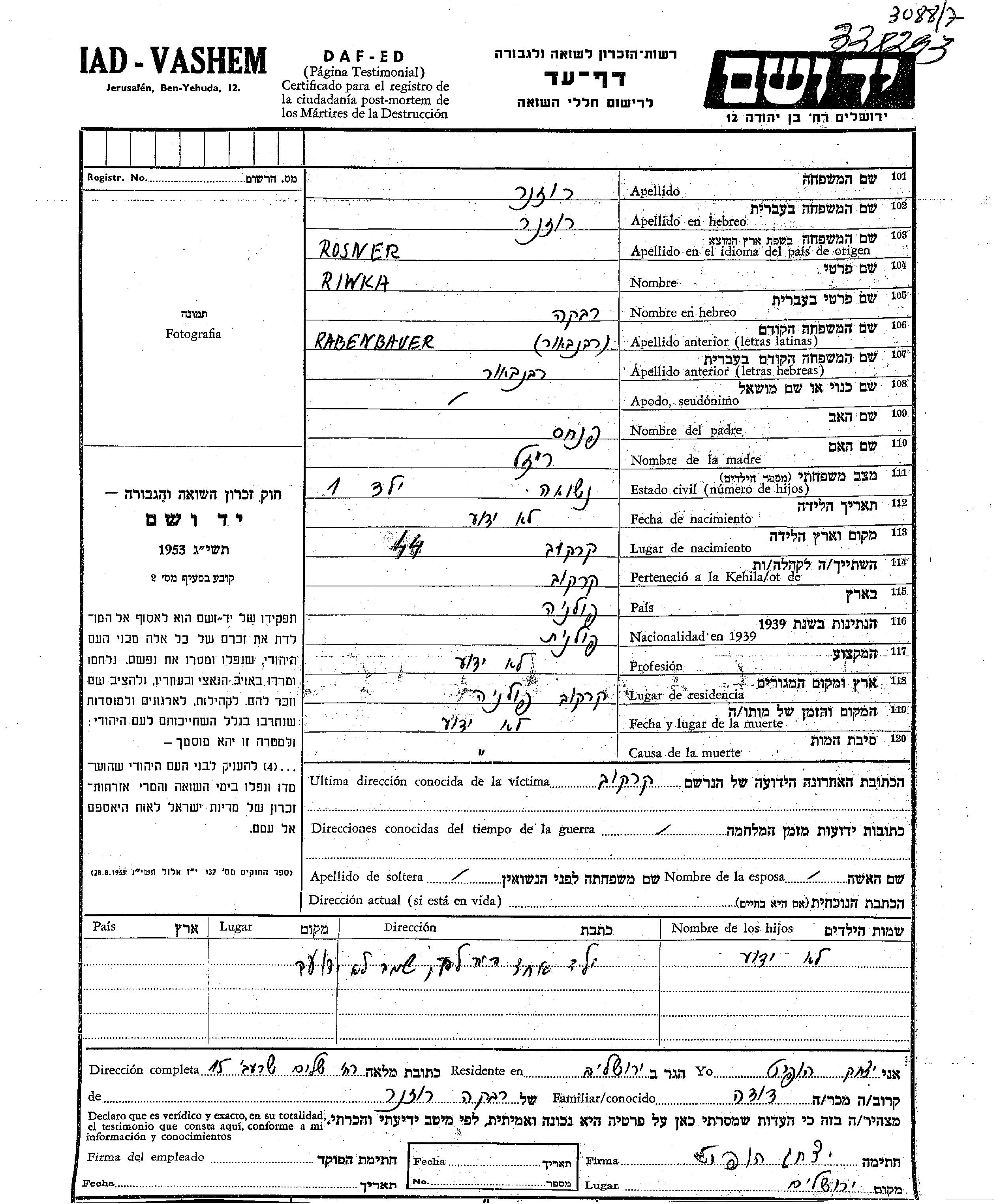 Riwka Rosner, geb. Rabenbauer wurde in Krakow, Polen geboren. Sie war die Tochter von Pinkhas und Reizl. Sie war Verheiratet. Vor dem Zweiten Weltkrieg lebte sie in Krakow, Polen. Während des Krieges war sie in Krakow, Polen.