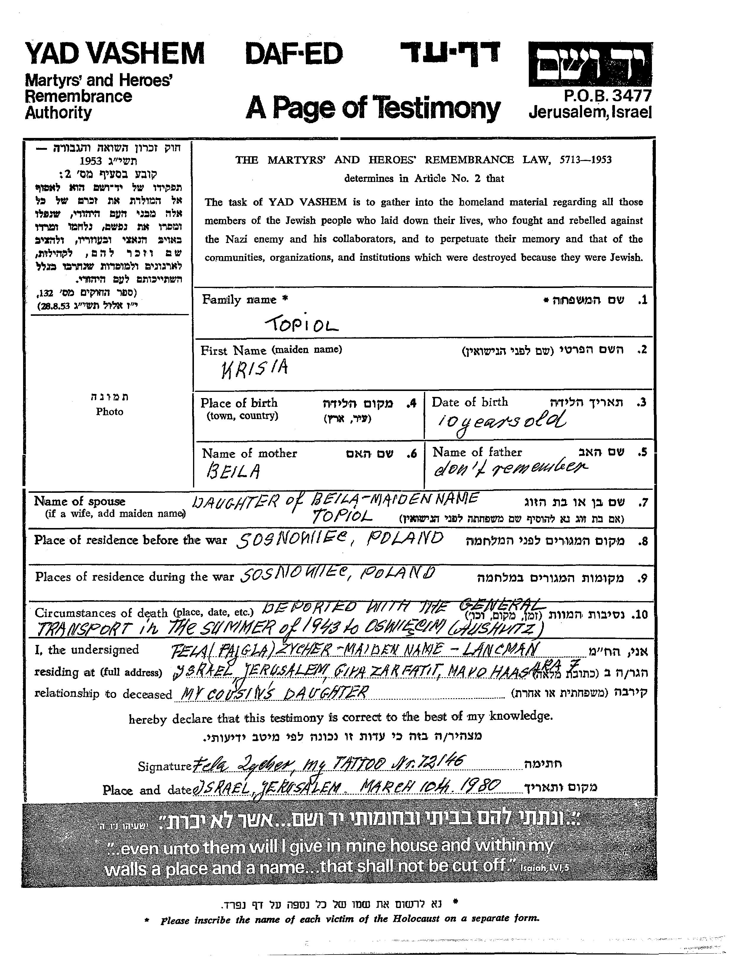 Krisia Topiol wurde Sie war die Tochter von Beila. Sie war Ledig. Vor dem Zweiten Weltkrieg lebte sie in Sosnowiec, Polen. Während des Krieges war sie in Sosnowiec, Polen.