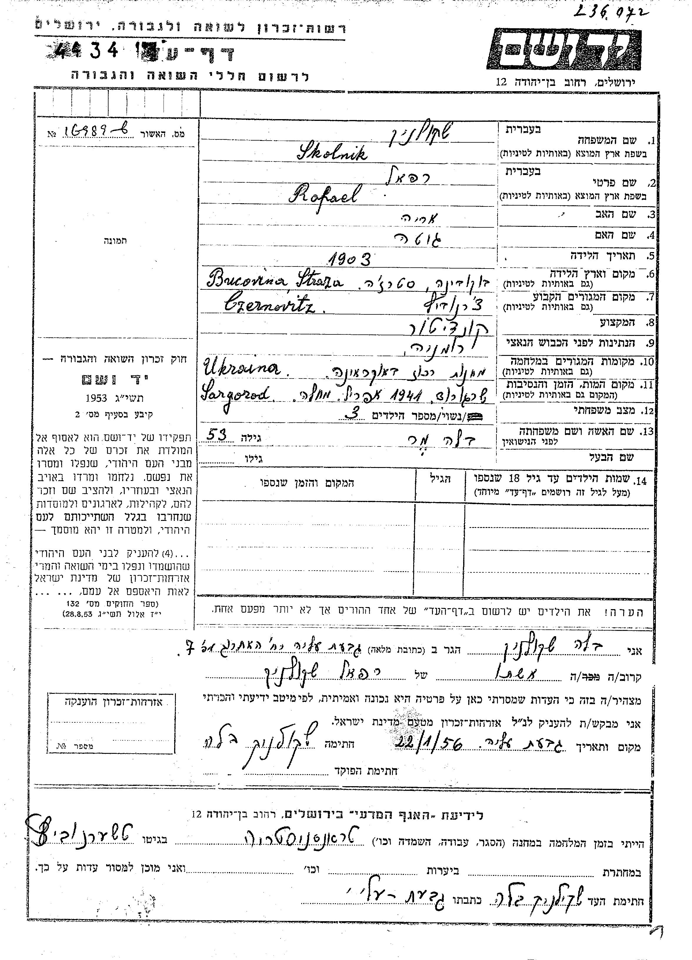 Rafael Skolnik wurde im Jahr 1903 in Straja, Rumänien geboren. Er war der Sohn von Arie und Guta. Er war Konditor und mit Bela, geb. Mer Verheiratet. Vor dem Zweiten Weltkrieg lebte er in Czernowitz, Rumänien. Während des Krieges war er in Ukraine (UdSSR).