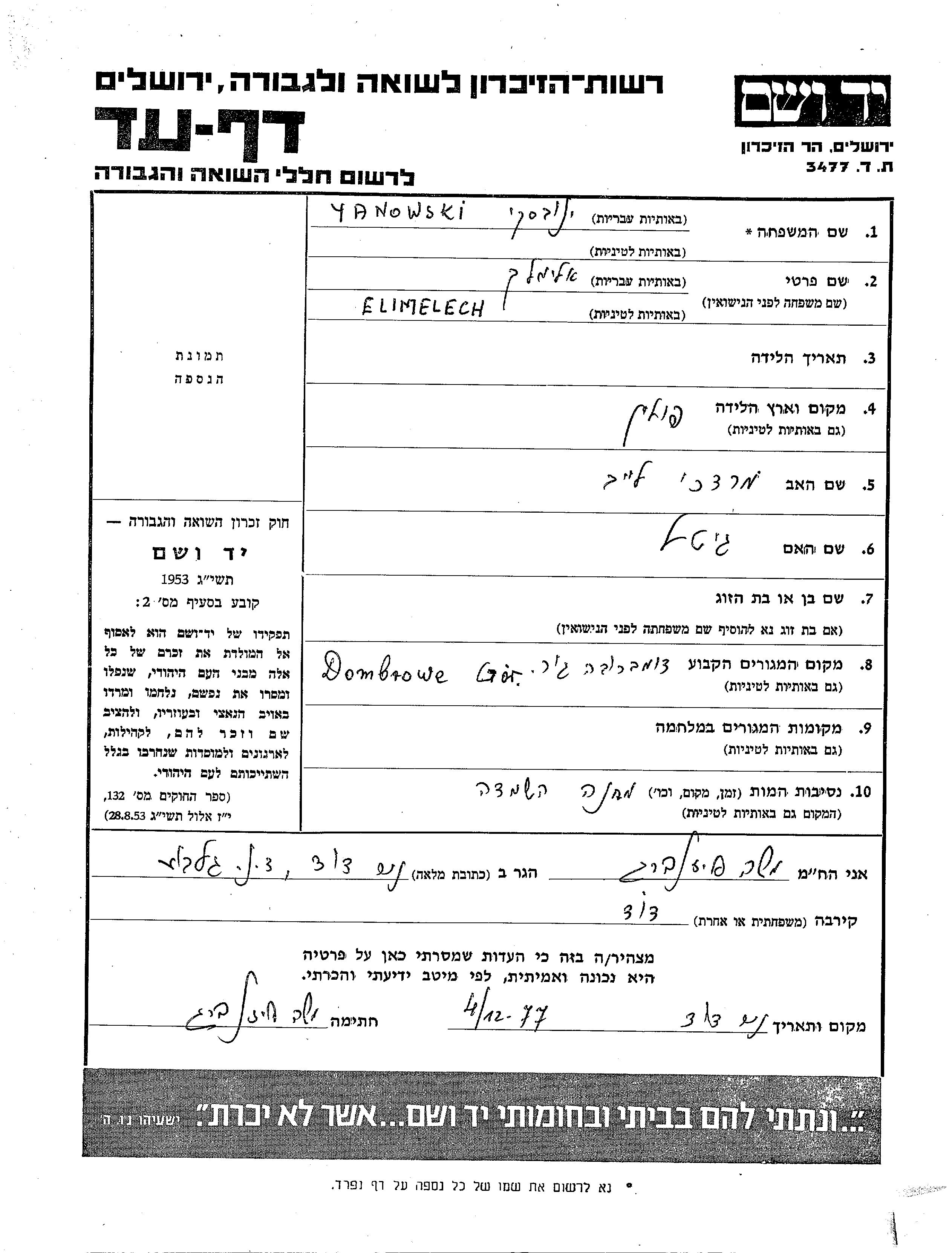 Elimelech Yanowski wurde in Polen geboren. Er war der Sohn von Mordekhai Leib und Gitel. Vor dem Zweiten Weltkrieg lebte er in Dombrove Gur, Polen.