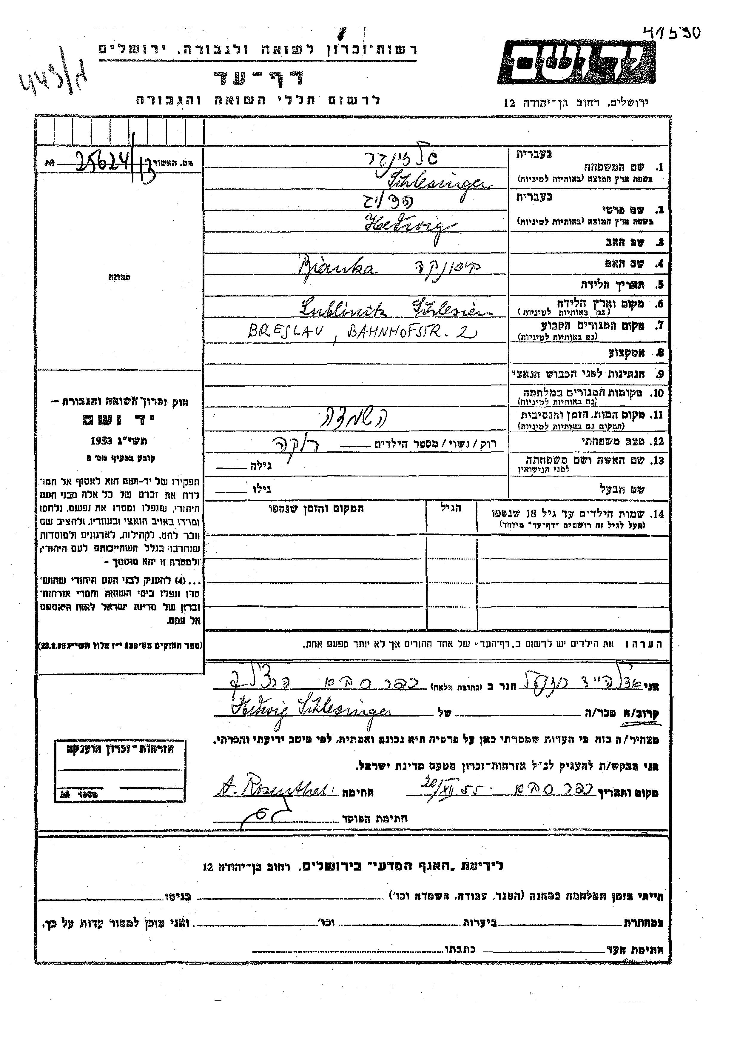 Hedwig Schlessinger wurde in Lublinitz, Polen geboren. Sie war die Tochter von Bianka. Sie war Ledig. Vor dem Zweiten Weltkrieg lebte sie in Breslau, Deutsches Reich.