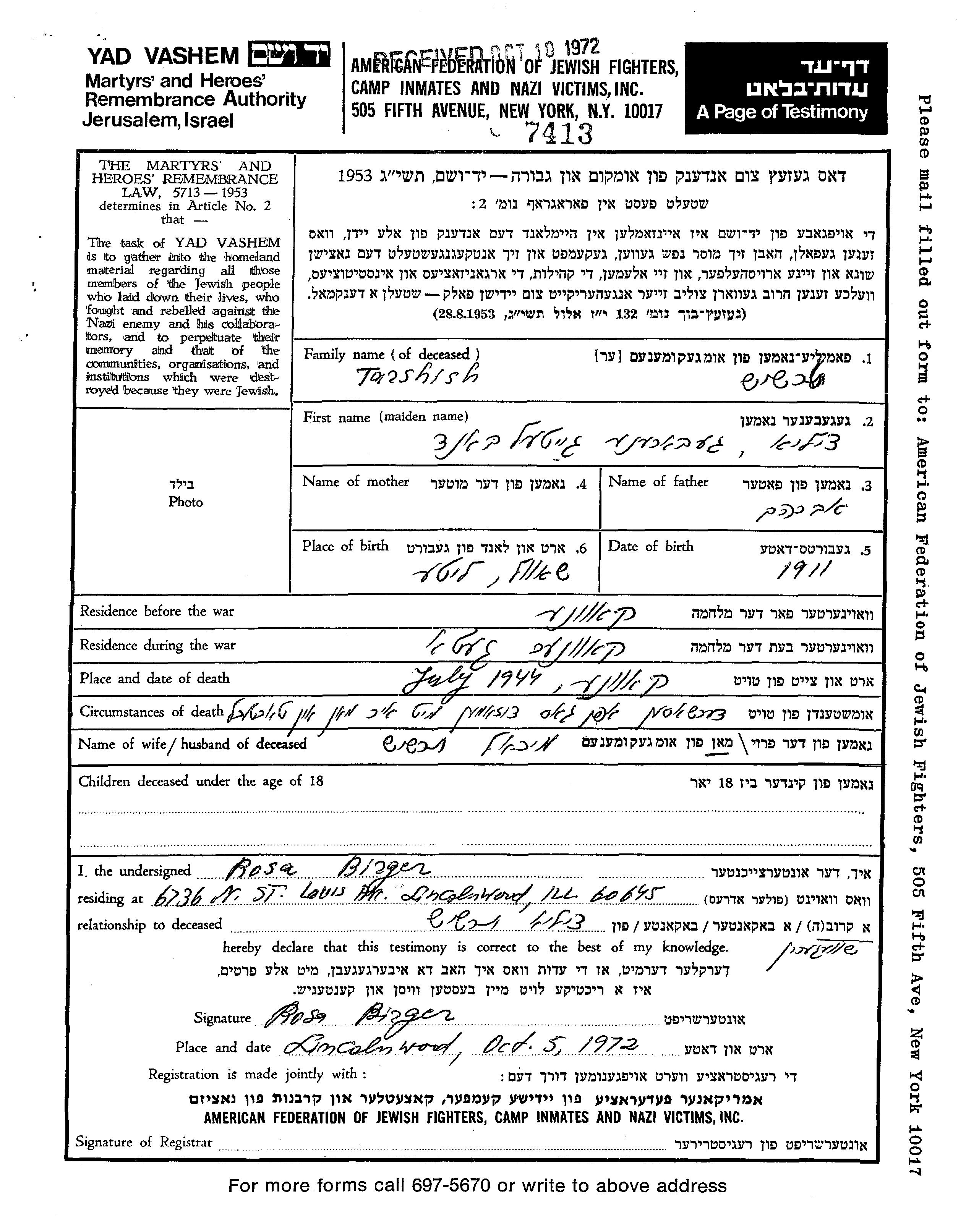 Tzila Tarshish, geb. Band wurde im Jahr 1911 in Siaulenai, Litauen geboren. Sie war die Tochter von Avraham. Sie war mit Mikhael Verheiratet. Vor dem Zweiten Weltkrieg lebte sie in Kovno, Litauen. Während des Krieges war sie in Kovno, Litauen.