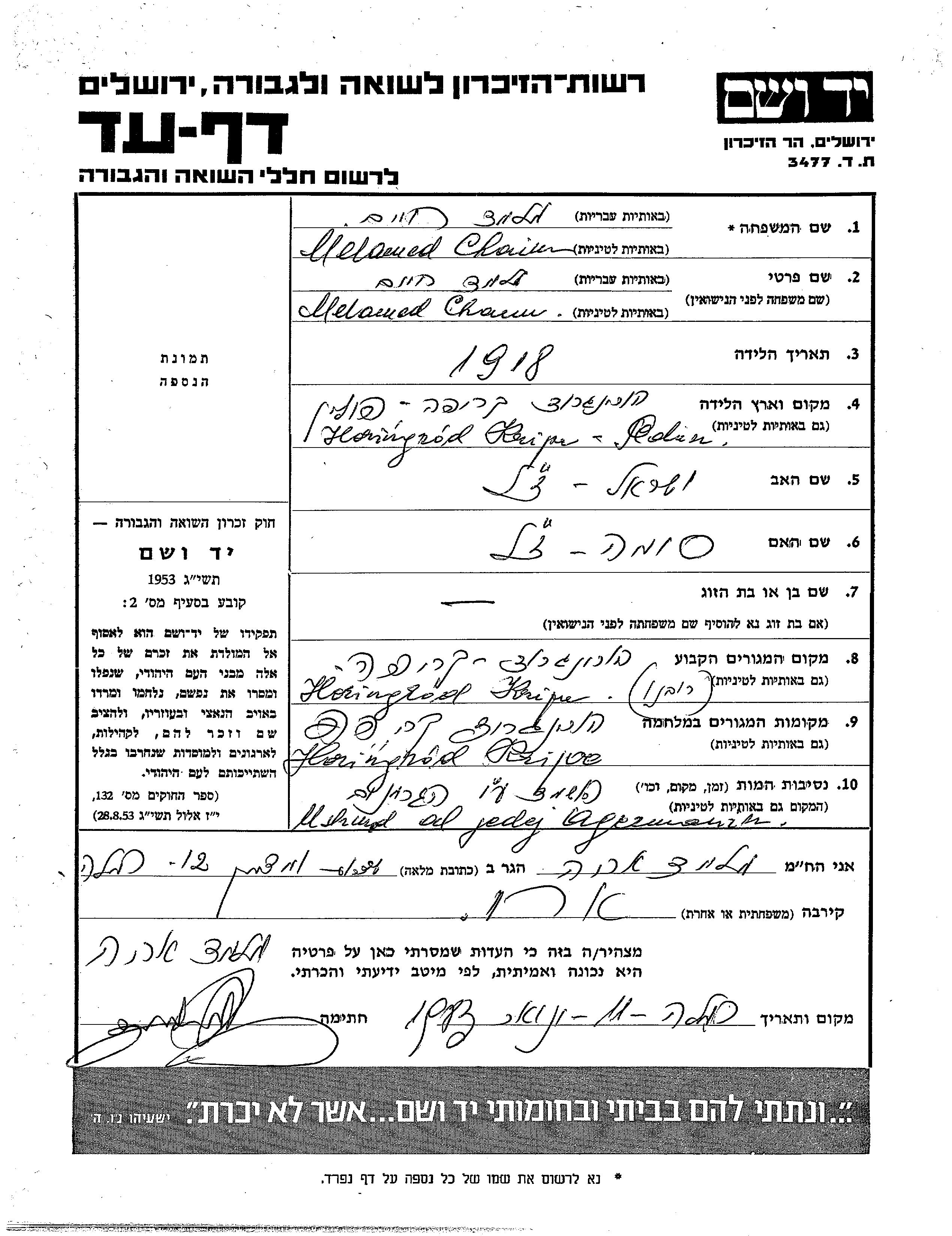 Chaim Melamed wurde im Jahr 1918 in Horingrod Krupa, Polen geboren. Er war der Sohn von Yisrael und Sima. Er war Ledig. Vor dem Zweiten Weltkrieg lebte er in Horingrod Krupa, Polen. Während des Krieges war er in Horingrod Krupa, Polen.