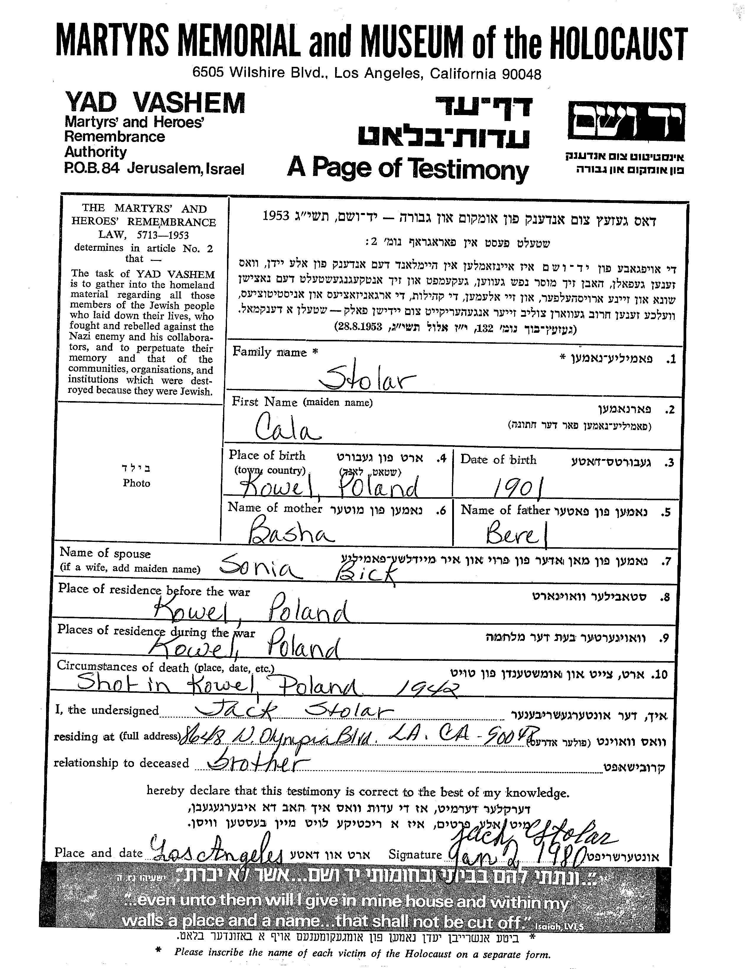 Cala Stolar wurde im Jahr 1901 in Kowel, Polen geboren. Er war der Sohn von Berl und Basha. Er war mit Sonia, geb. Bick Verheiratet. Vor dem Zweiten Weltkrieg lebte er in Kowel, Polen. Während des Krieges war er in Kowel, Polen.