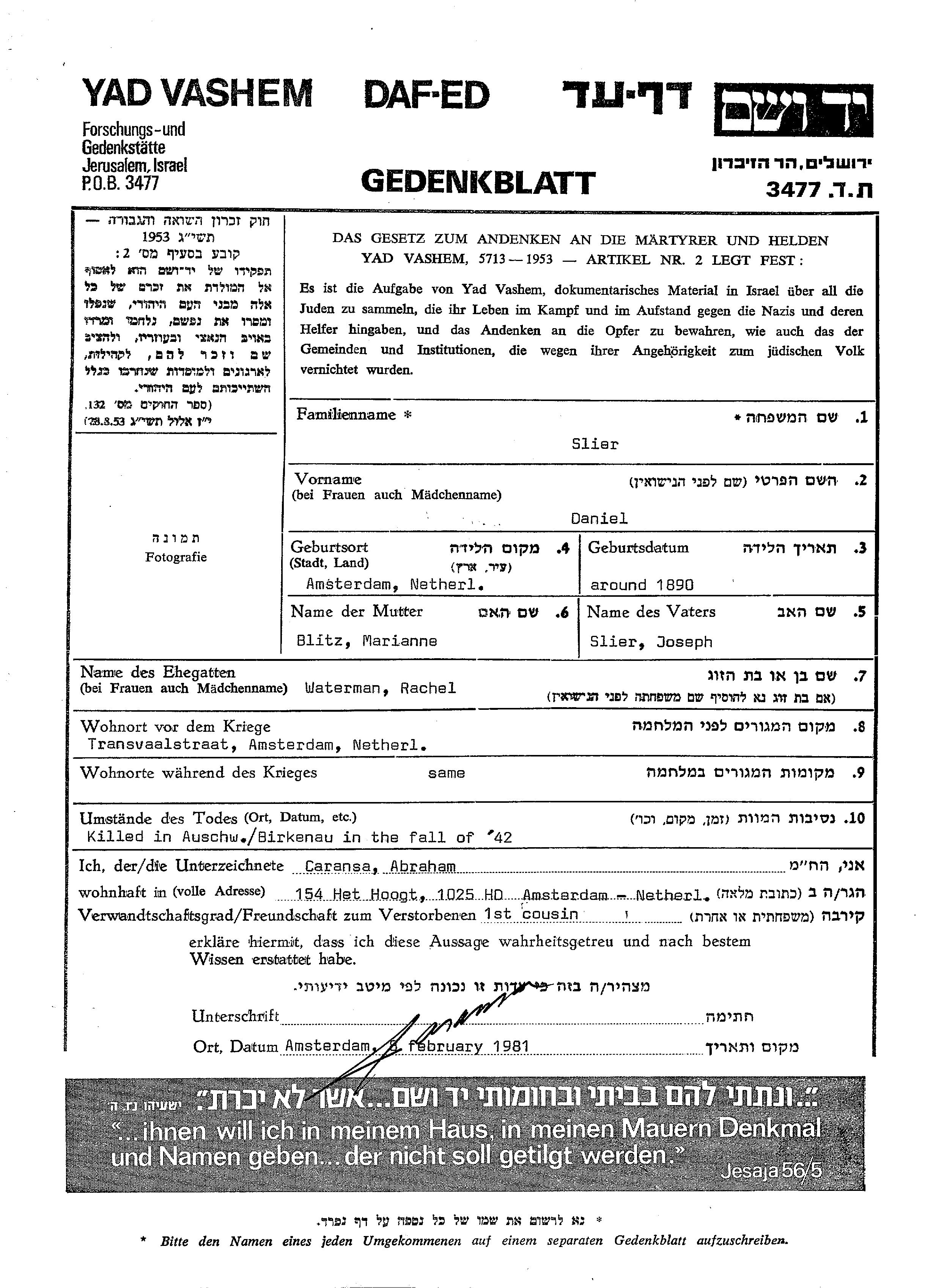 Daniel Slier wurde im Jahr 1890 in Amsterdam, Niederlande geboren. Er war der Sohn von Joseph und Marianne. Er war mit Rachel, geb. Waterman Verheiratet. Vor dem Zweiten Weltkrieg lebte er in Amsterdam, Niederlande. Während des Krieges war er in Amsterdam, Niederlande.