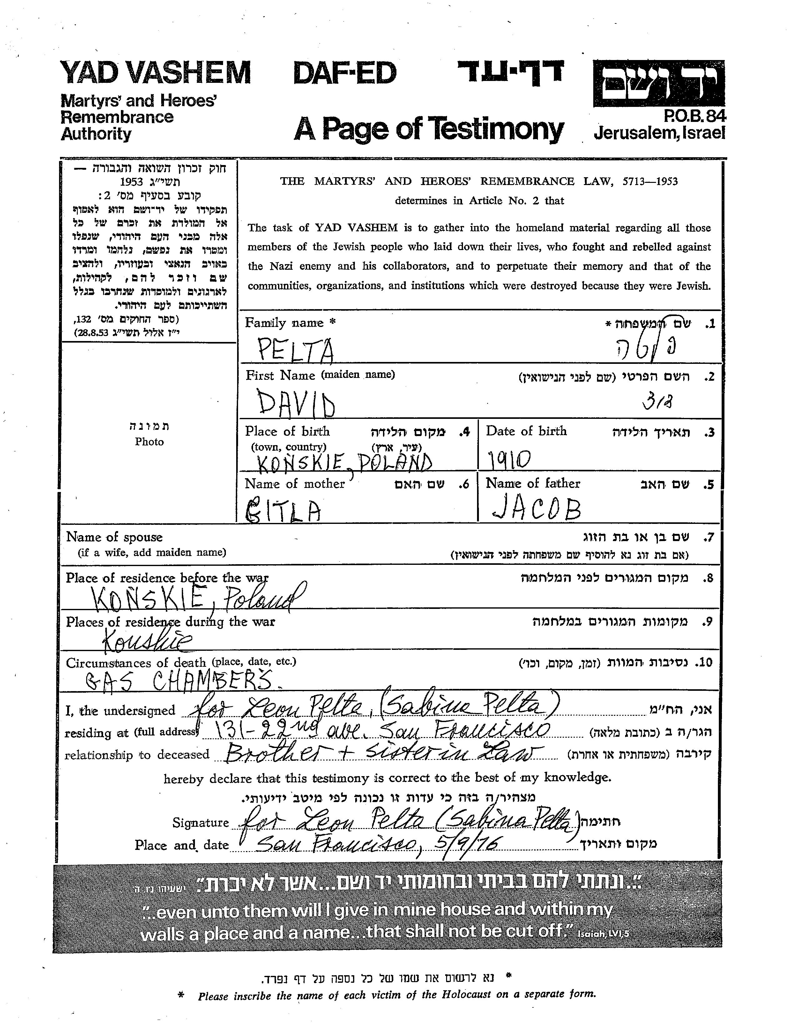 David Pelta wurde im Jahr 1910 in Konskie, Polen geboren. Er war der Sohn von Jacob und Gitla. Vor dem Zweiten Weltkrieg lebte er in Konskie, Polen. Während des Krieges war er in Konskie, Polen.