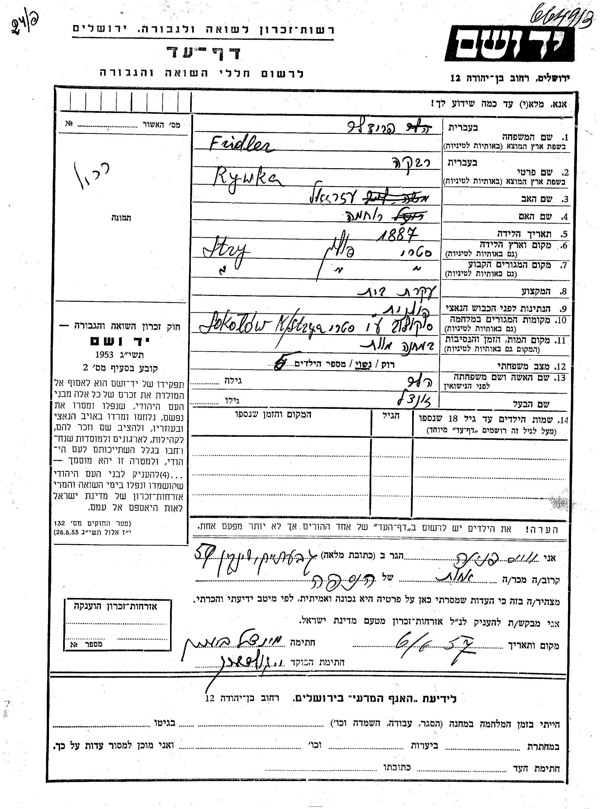 Rywka Fridler, geb. Heler wurde im Jahr 1887 in Stry, Polen geboren. Sie war die Tochter von Azriel und Rukhama. Sie war Hausfrau und mit Zindel Verheiratet. Vor dem Zweiten Weltkrieg lebte sie in Stry, Polen. Während des Krieges war sie in Sokolow, Polen.