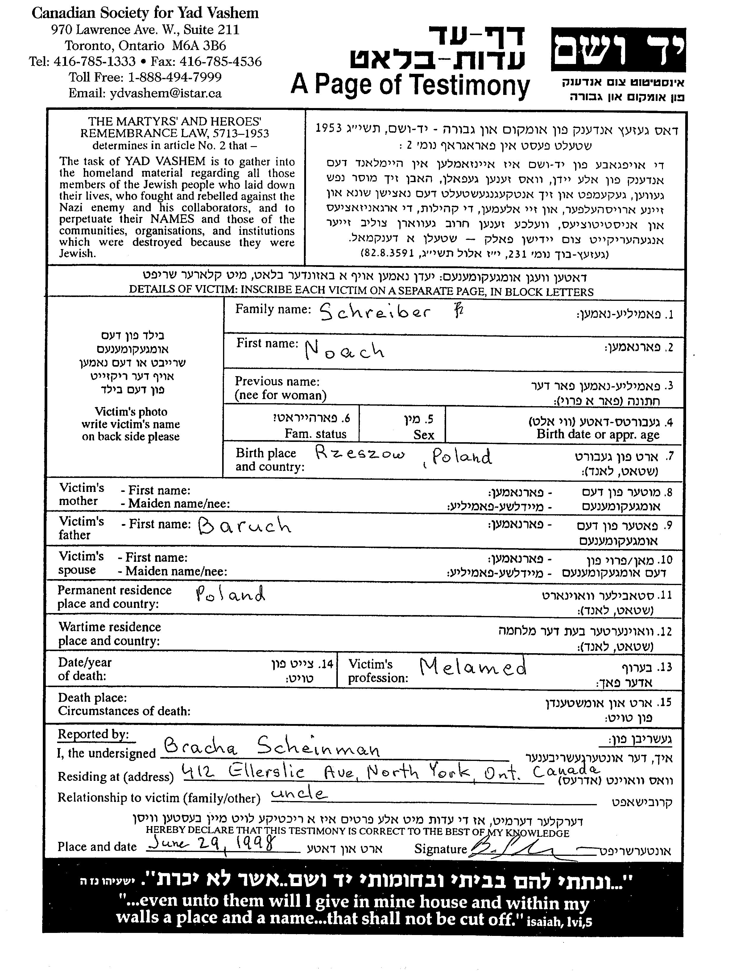 Noach Schreiber wurde in Rzeszow, Polen geboren. Er war der Sohn von Baruch. Er war Chederlehrer. Vor dem Zweiten Weltkrieg lebte er in Polen.