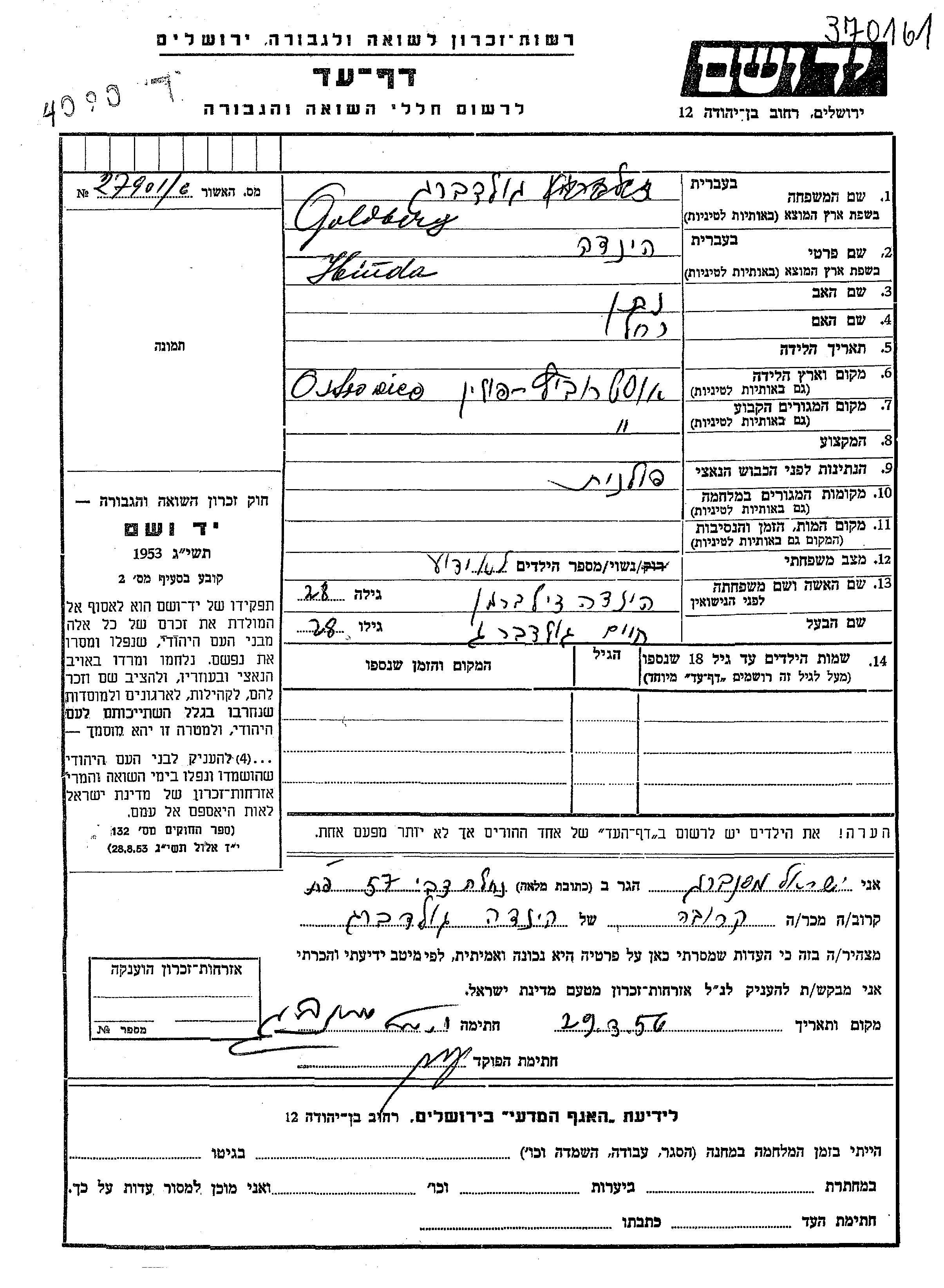 Hinde Goldberg, geb. Zilberman wurde in Ostrowiec, Polen geboren. Sie war die Tochter von Natan und Rakhel. Sie war mit Khaim Verheiratet. Vor dem Zweiten Weltkrieg lebte sie in Ostrowiec, Polen.