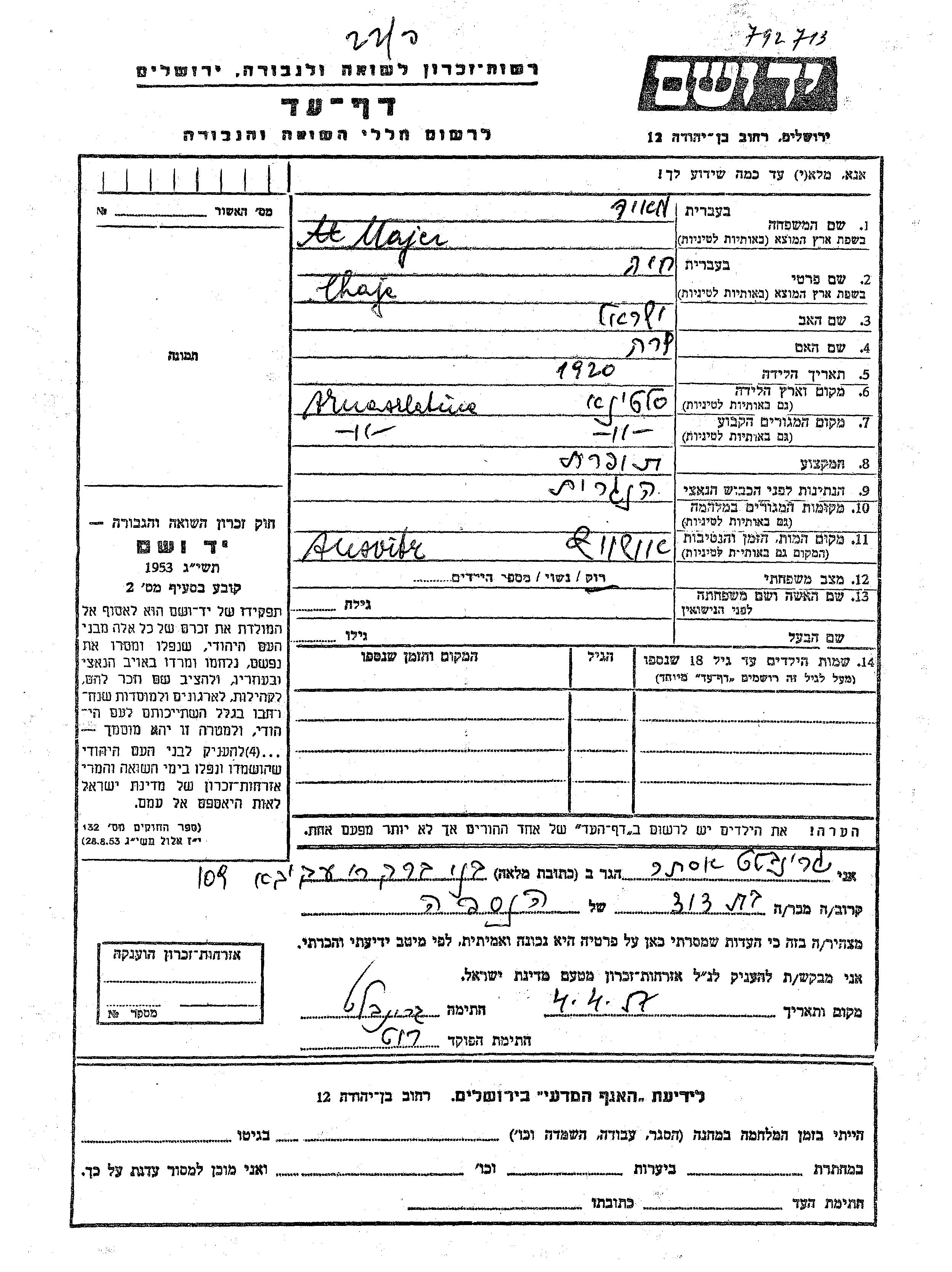 Chaje wurde in der Schoah ermordet. Todesort: Auschwitz, Polen.