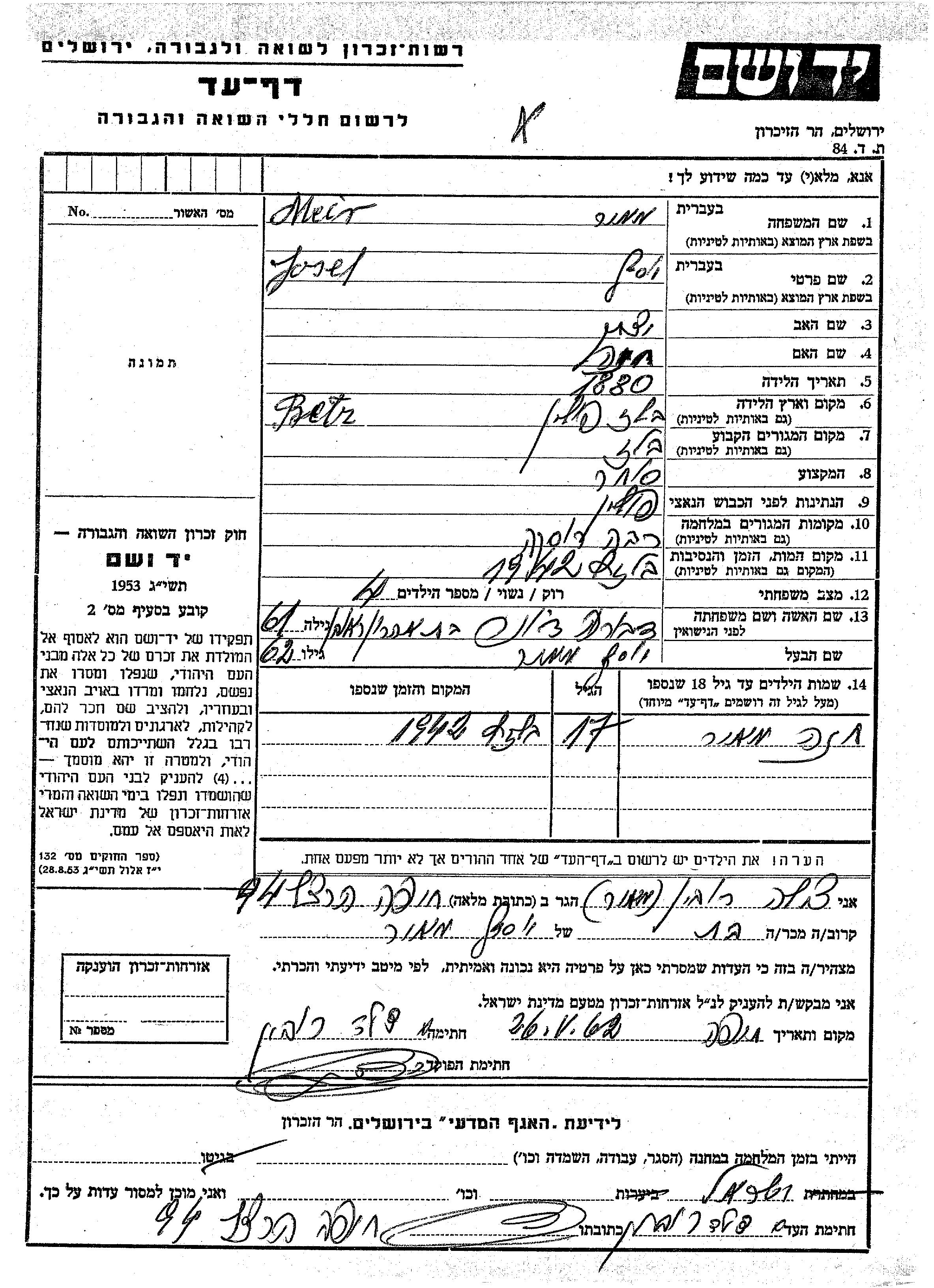 Josef Meier wurde im Jahr 1880 in Belz, Polen geboren. Er war der Sohn von Yitzkhak und Khana. Er war Kaufmann/-frau und mit Dvora, geb. Duner Verheiratet. Vor dem Zweiten Weltkrieg lebte er in Belz, Polen. Während des Krieges war er in Rawa Ruska, Polen.