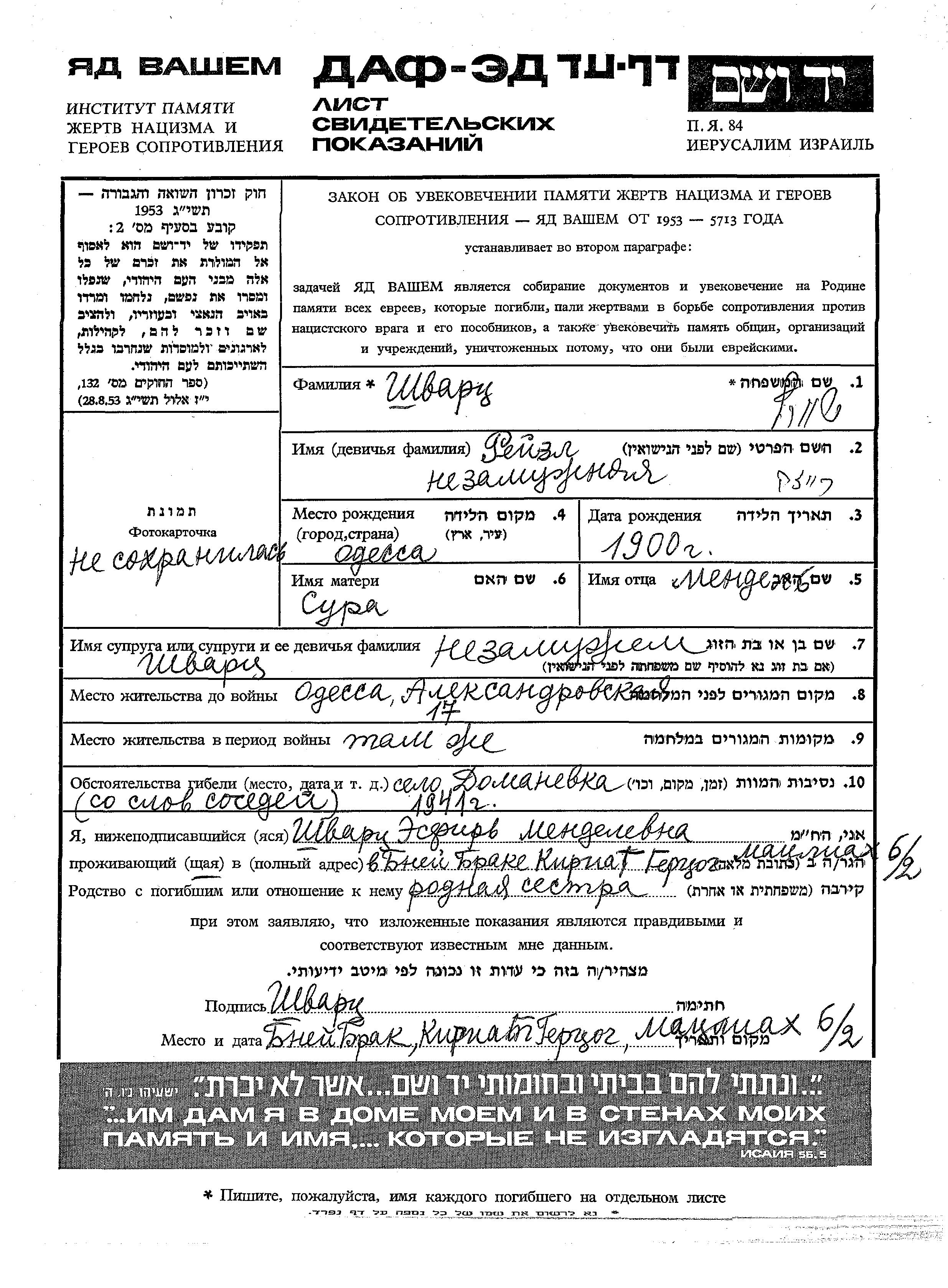 Reizl Schwartz wurde im Jahr 1900 in Odessa, Ukraine (UdSSR) geboren. Sie war die Tochter von Mendel und Sura. Sie war Ledig. Vor dem Zweiten Weltkrieg lebte sie in Odessa, Ukraine (UdSSR). Während des Krieges war sie in Odessa, Ukraine (UdSSR).