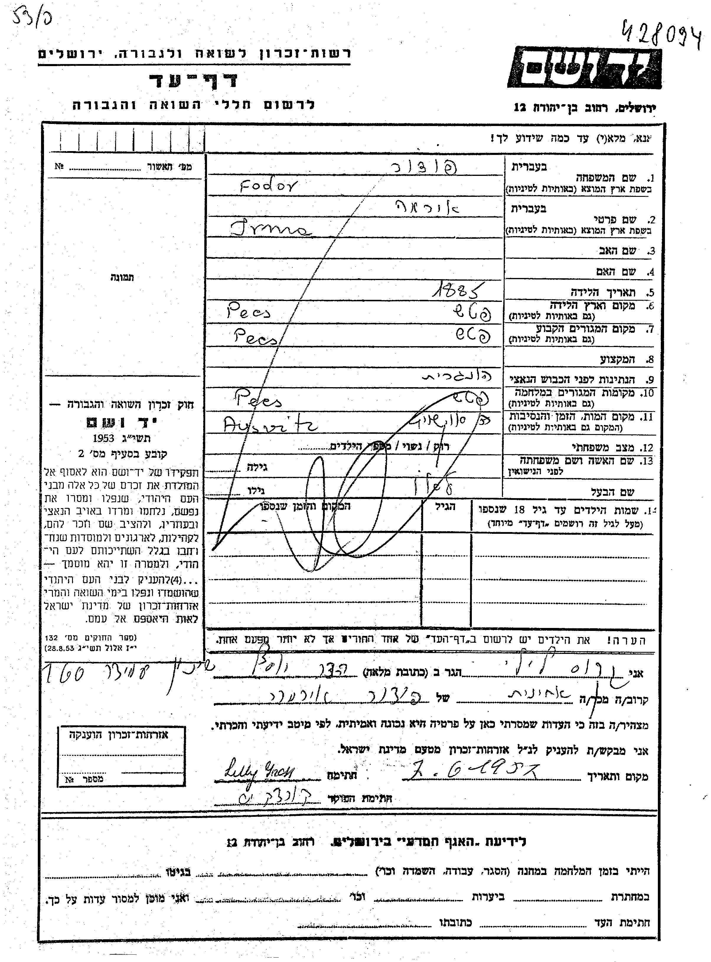 Irma Fodor wurde im Jahr 1885 in Pecs, Ungarn geboren. Sie war mit Leo Verheiratet. Vor dem Zweiten Weltkrieg lebte sie in Pecs, Ungarn. Während des Krieges war sie in Pecs, Ungarn.
