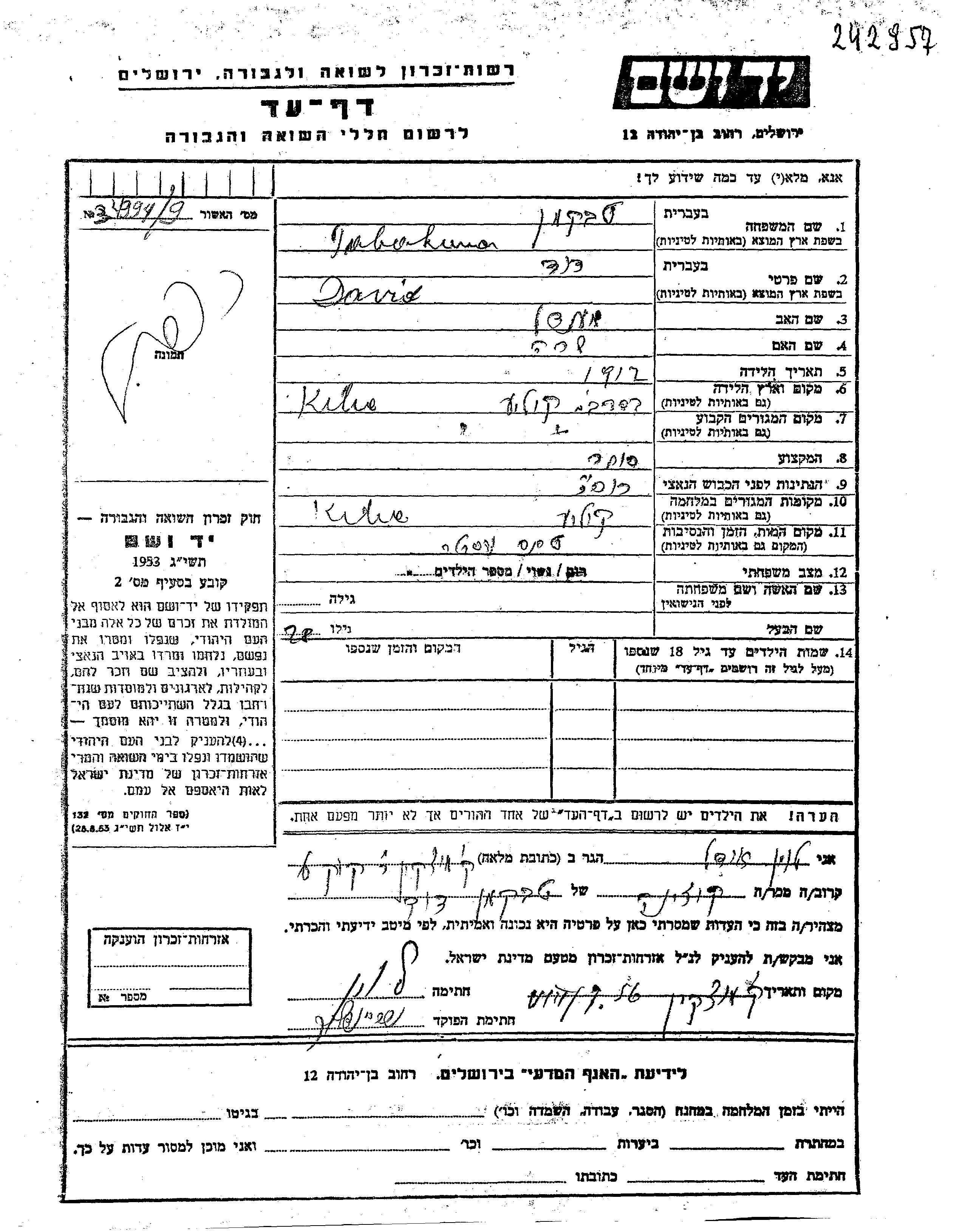 David Tabakman wurde im Jahr 1912 in Kilia, Rumänien geboren. Er war der Sohn von Mendl und Sara. Er war Kaufmann/-frau und Verheiratet. Vor dem Zweiten Weltkrieg lebte er in Kilia, Rumänien. Während des Krieges war er in Kilia, Rumänien.
