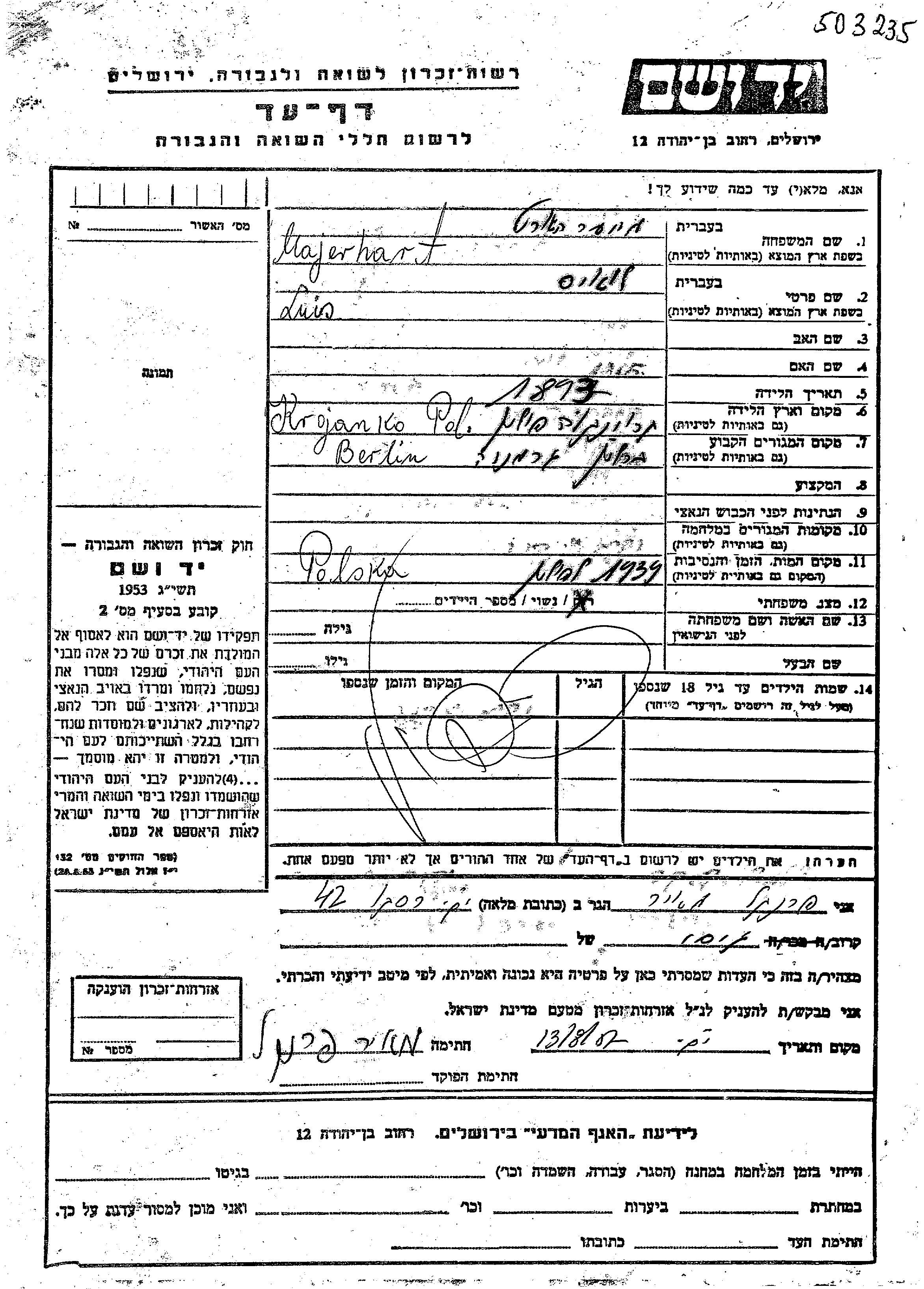 Luis Majer Hart wurde im Jahr 1893 in Krojanke, Deutsches Reich geboren. Er war Verheiratet. Vor dem Zweiten Weltkrieg lebte er in Berlin, Deutsches Reich.