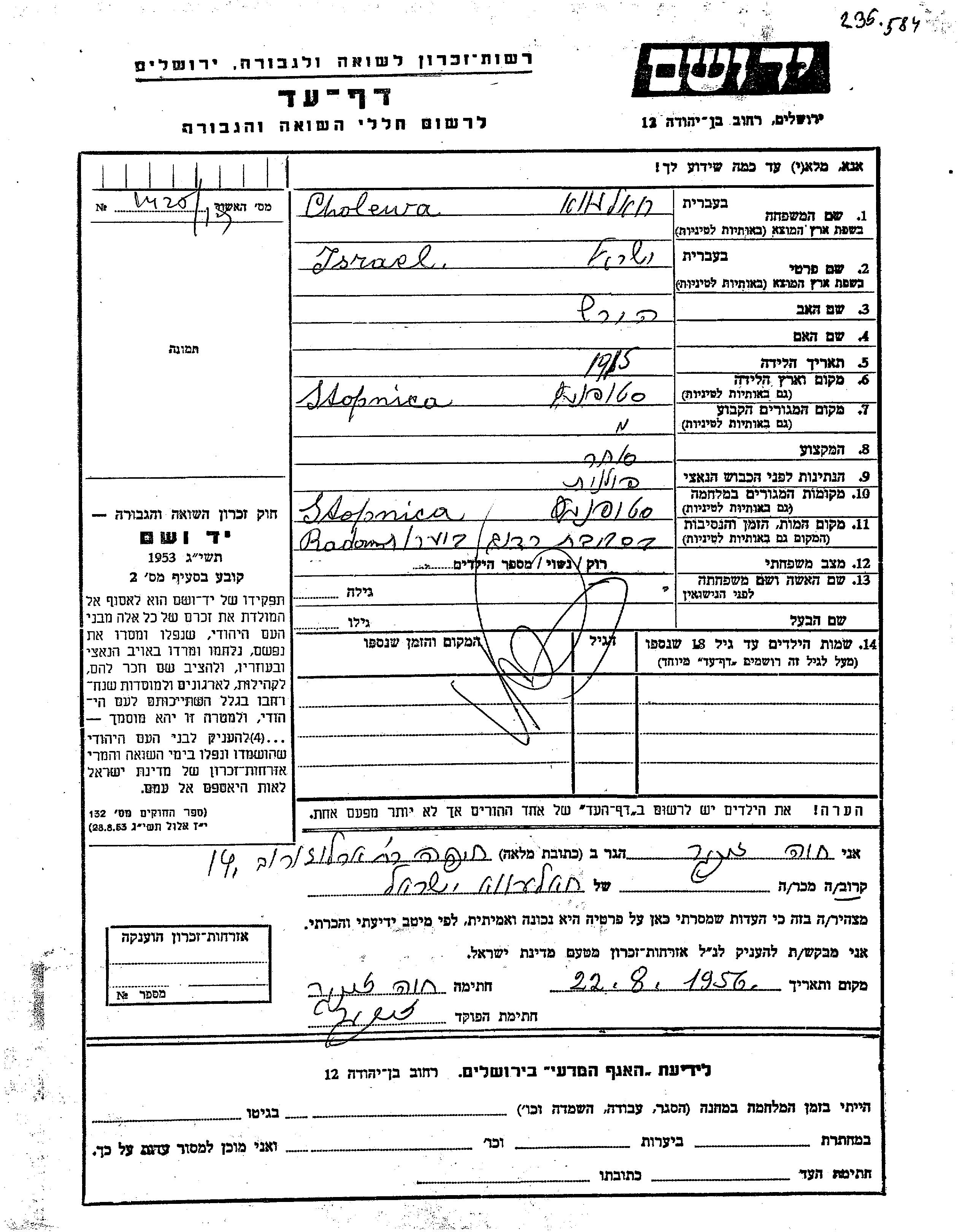Israel wurde in der Schoah ermordet. Todesort: Radom, Polen.