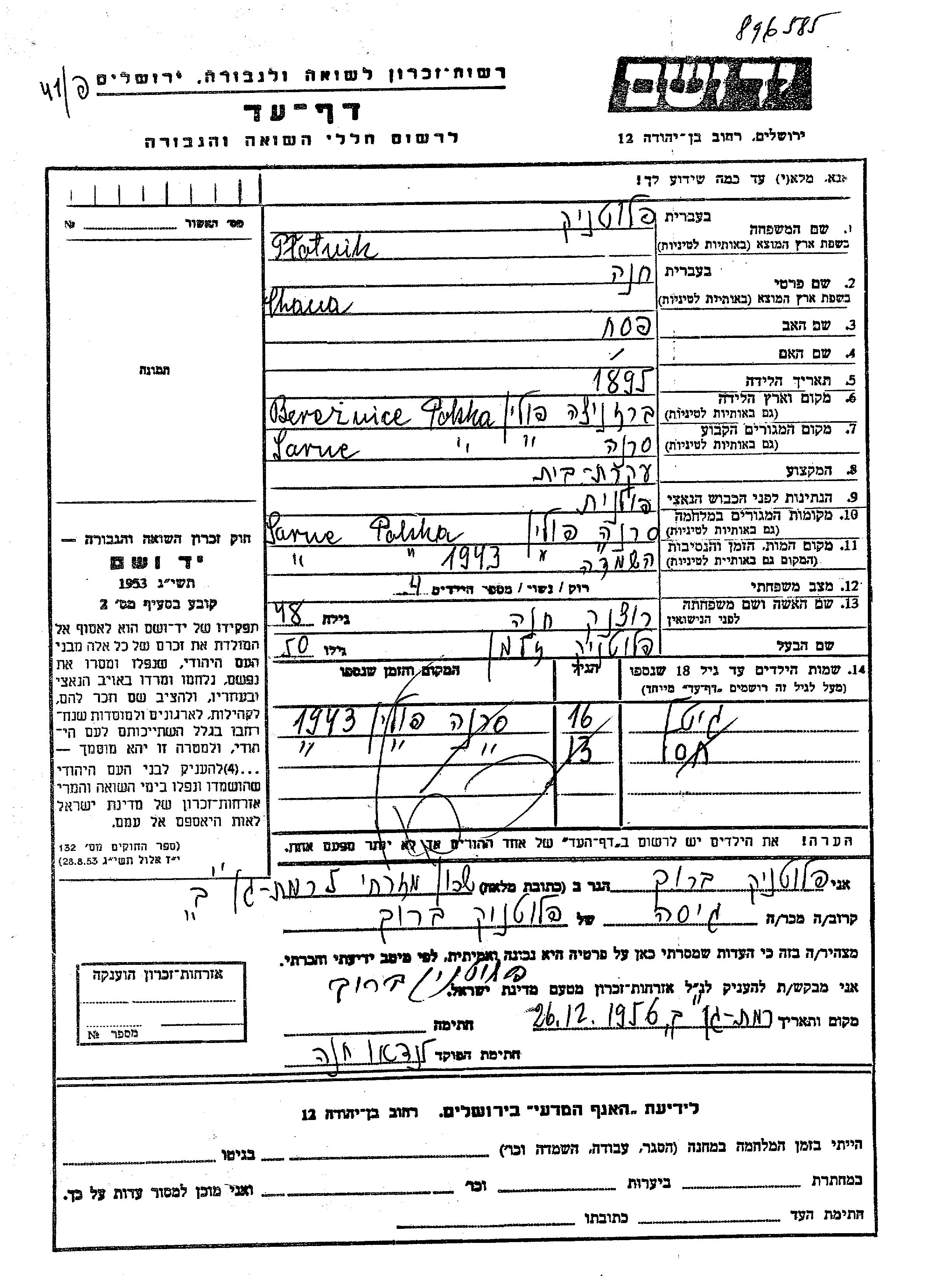 Chana Plotnik, geb. Zalman wurde im Jahr 1895 in Bereznica, Polen geboren. Sie war die Tochter von Pesakh. Sie war Hausfrau und mit Zalman Verheiratet. Vor dem Zweiten Weltkrieg lebte sie in Bereznica, Polen. Während des Krieges war sie in Sarny, Polen.