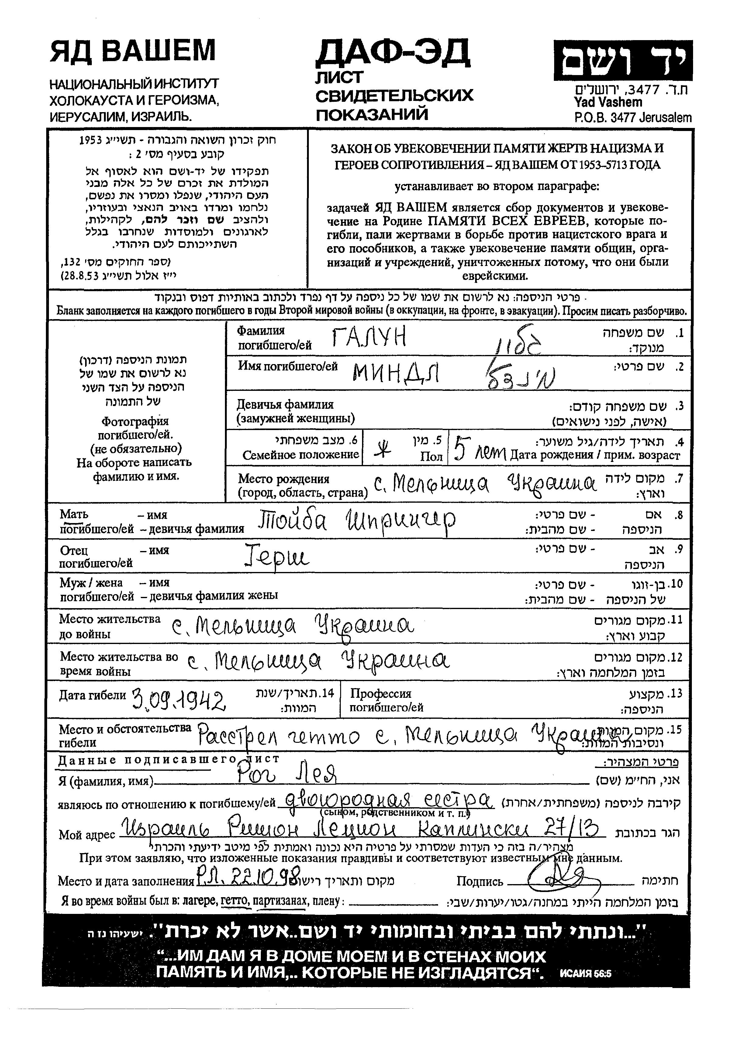 Mindl wurde in der Schoah ermordet. Todesort: Melnitza, Polen im Jahr 03/09/1942.