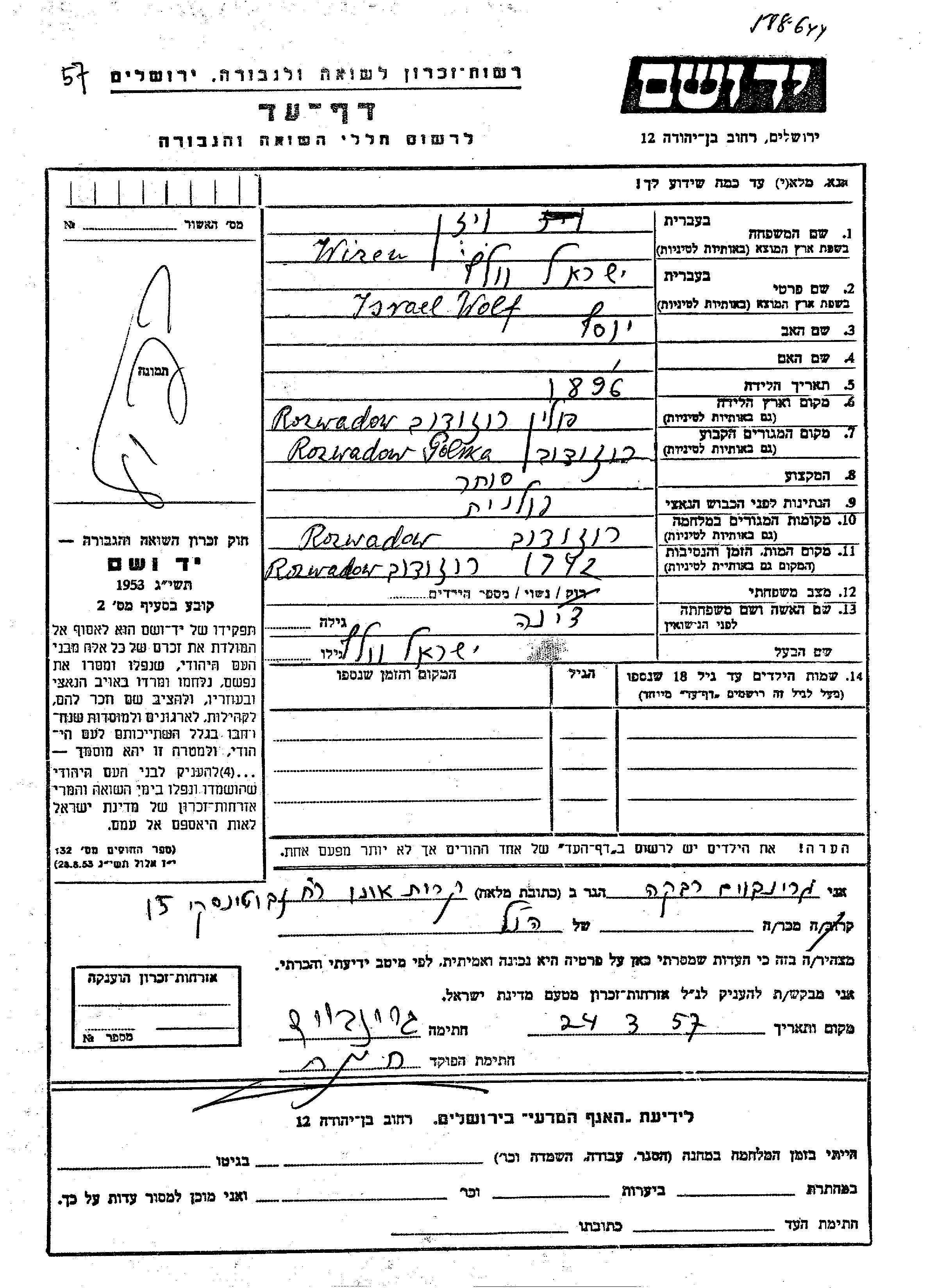 Ysrael Wolf wurde in der Schoah ermordet. Todesort: Rozwadów, Polen im Jahr 1942.