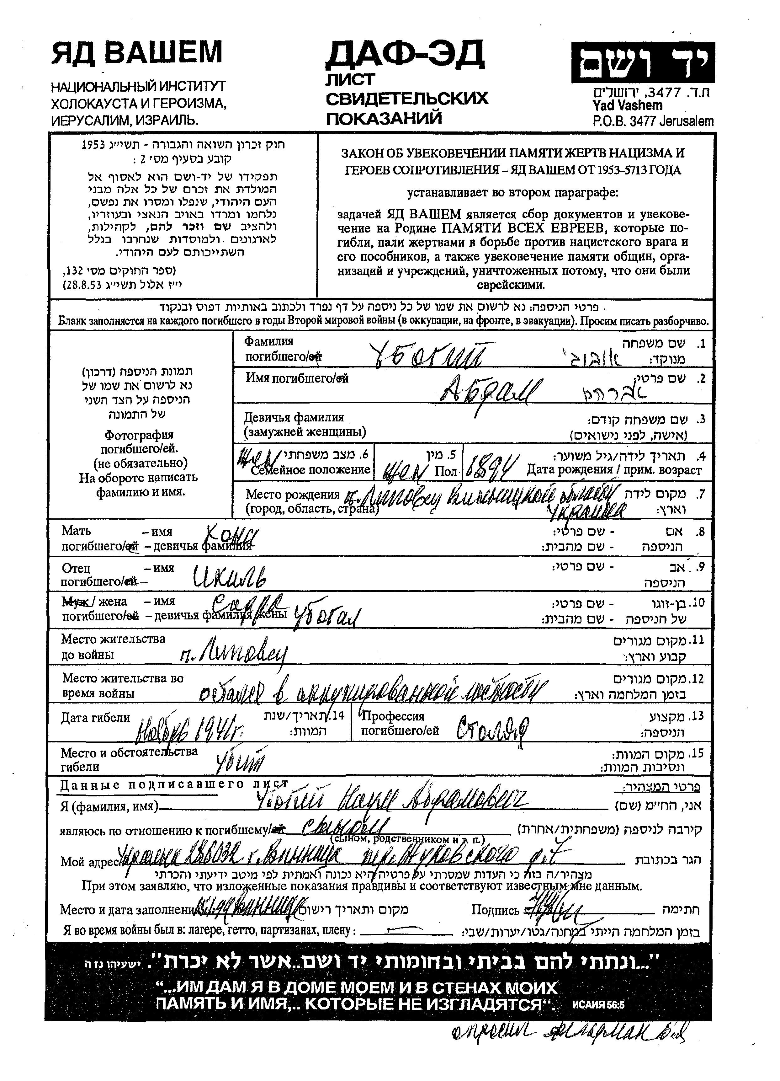 Abram Ubogi wurde im Jahr 1894 in Lipovetz, Ukraine (UdSSR) geboren. Er war der Sohn von Ikhil und Khona. Er war Tischler und mit Sarra Verheiratet. Vor dem Zweiten Weltkrieg lebte er in Lipovetz, Ukraine (UdSSR). Während des Krieges war er in Lipovetz, Ukraine (UdSSR).