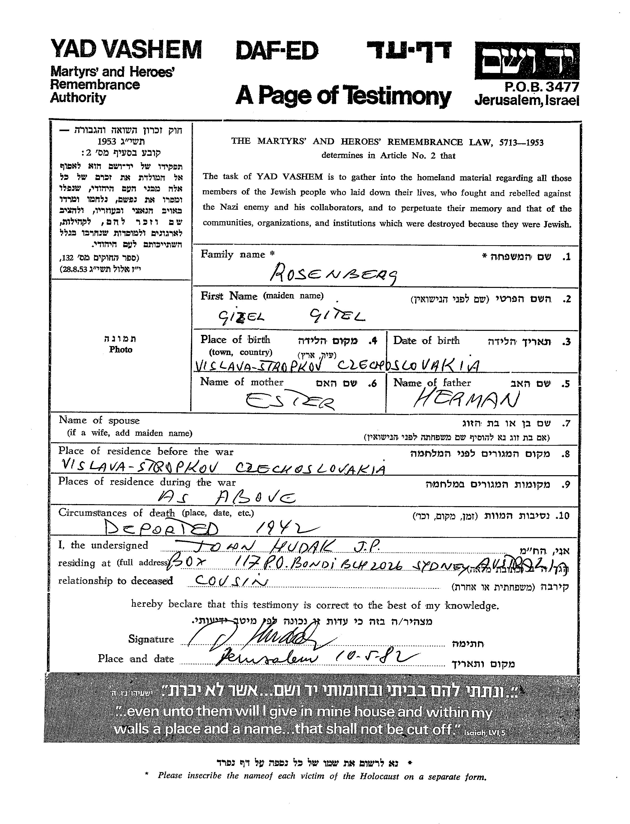 Gitel Rosenberg wurde in Vislava, Tschechoslowakei geboren. Sie war die Tochter von Herman und Ester. Vor dem Zweiten Weltkrieg lebte sie in Vislava, Tschechoslowakei. Während des Krieges war sie in Vislava, Tschechoslowakei.
