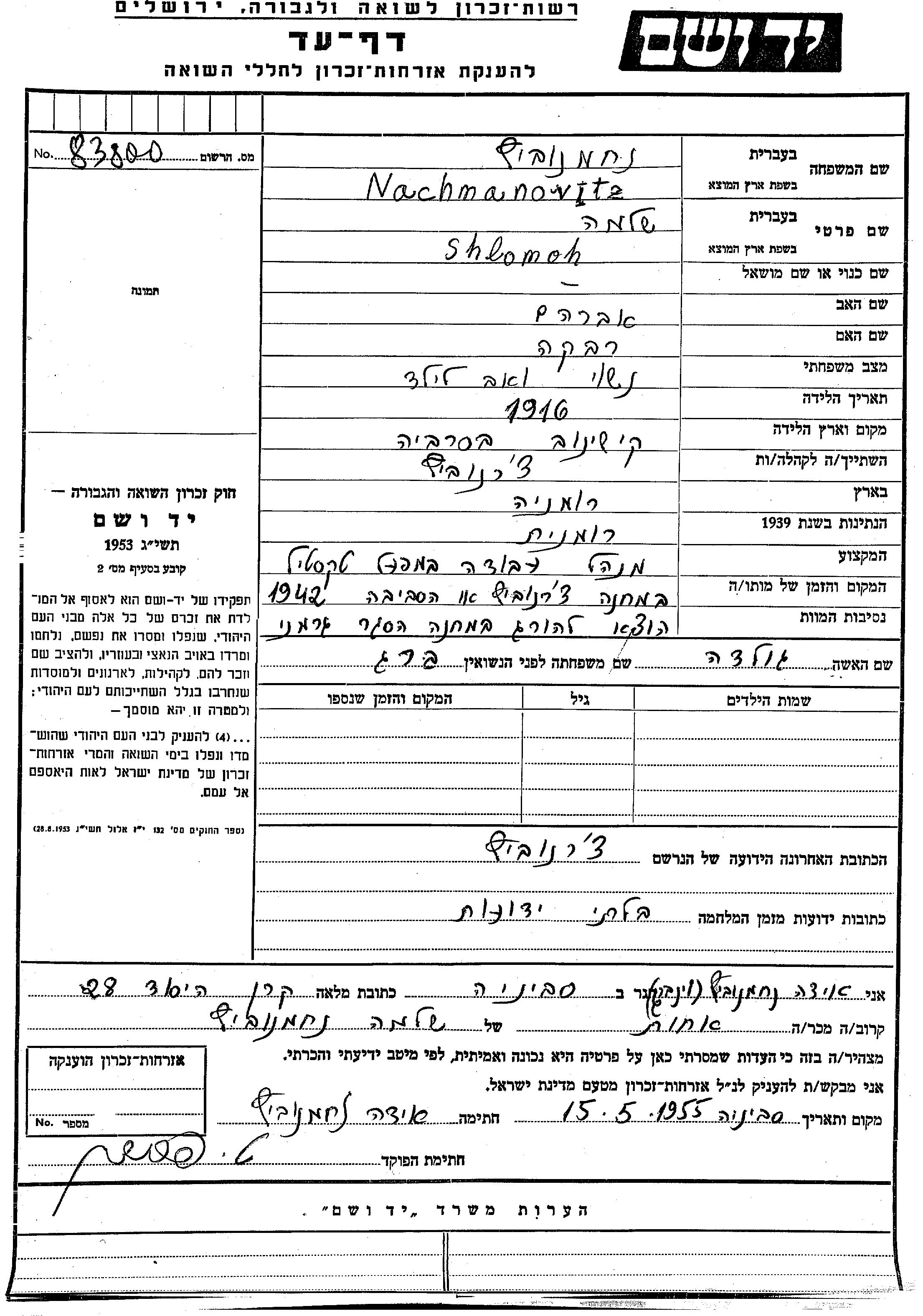 Shlomo Nachmanowicz wurde in Kishinev, Rumänien geboren. Er war der Sohn von Avraham und Rivka. Er war Weber/-in. Vor dem Zweiten Weltkrieg lebte er in Czernowitz, Rumänien. Während des Krieges war er in Bukarest, Rumänien.