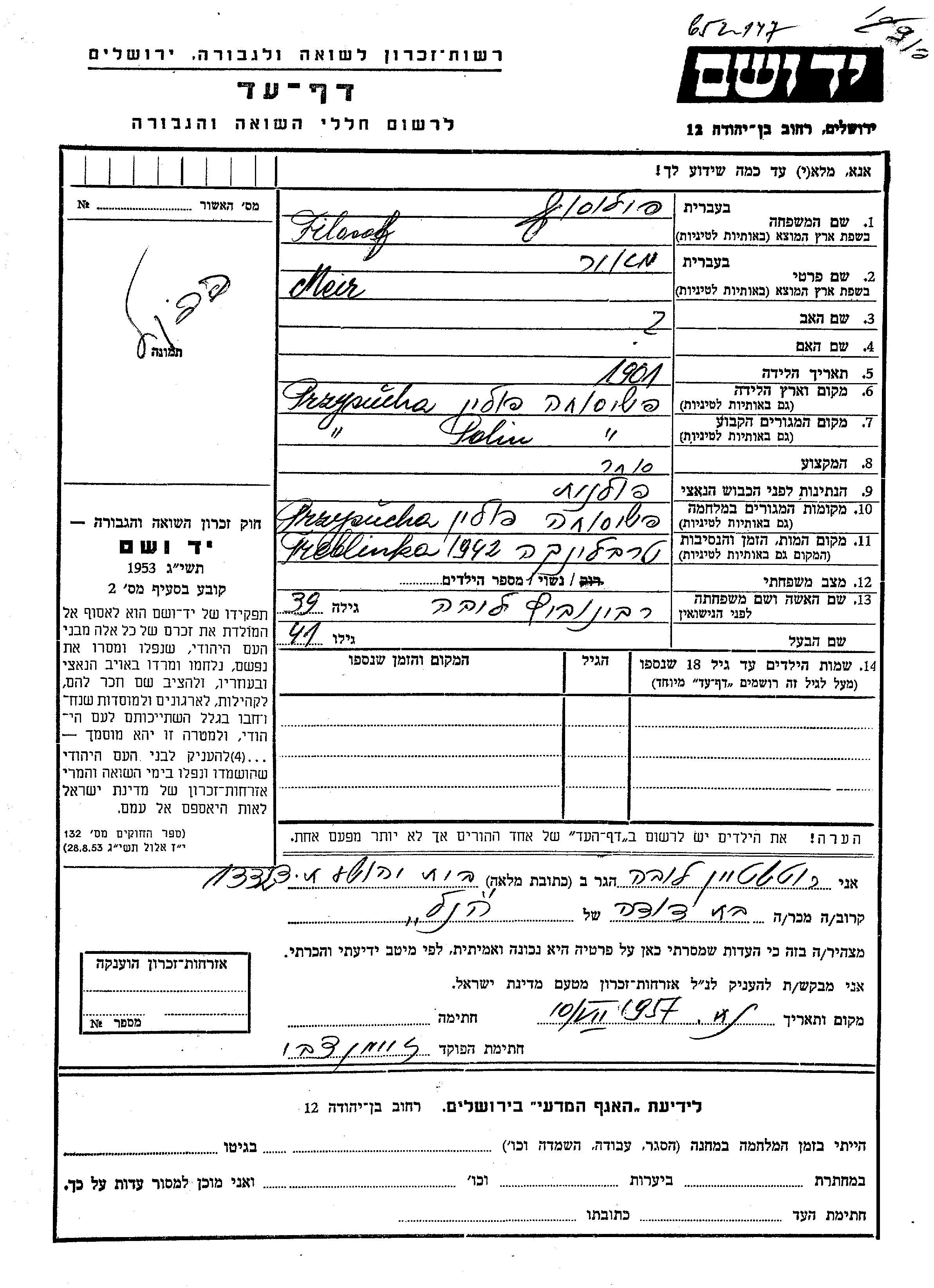 Meir Filozof wurde im Jahr 1901 in Przysucha, Polen geboren. Er war Kaufmann/-frau und mit Liba, geb. Rabinovitz Verheiratet. Vor dem Zweiten Weltkrieg lebte er in Przysucha, Polen. Während des Krieges war er in Przysucha, Polen.