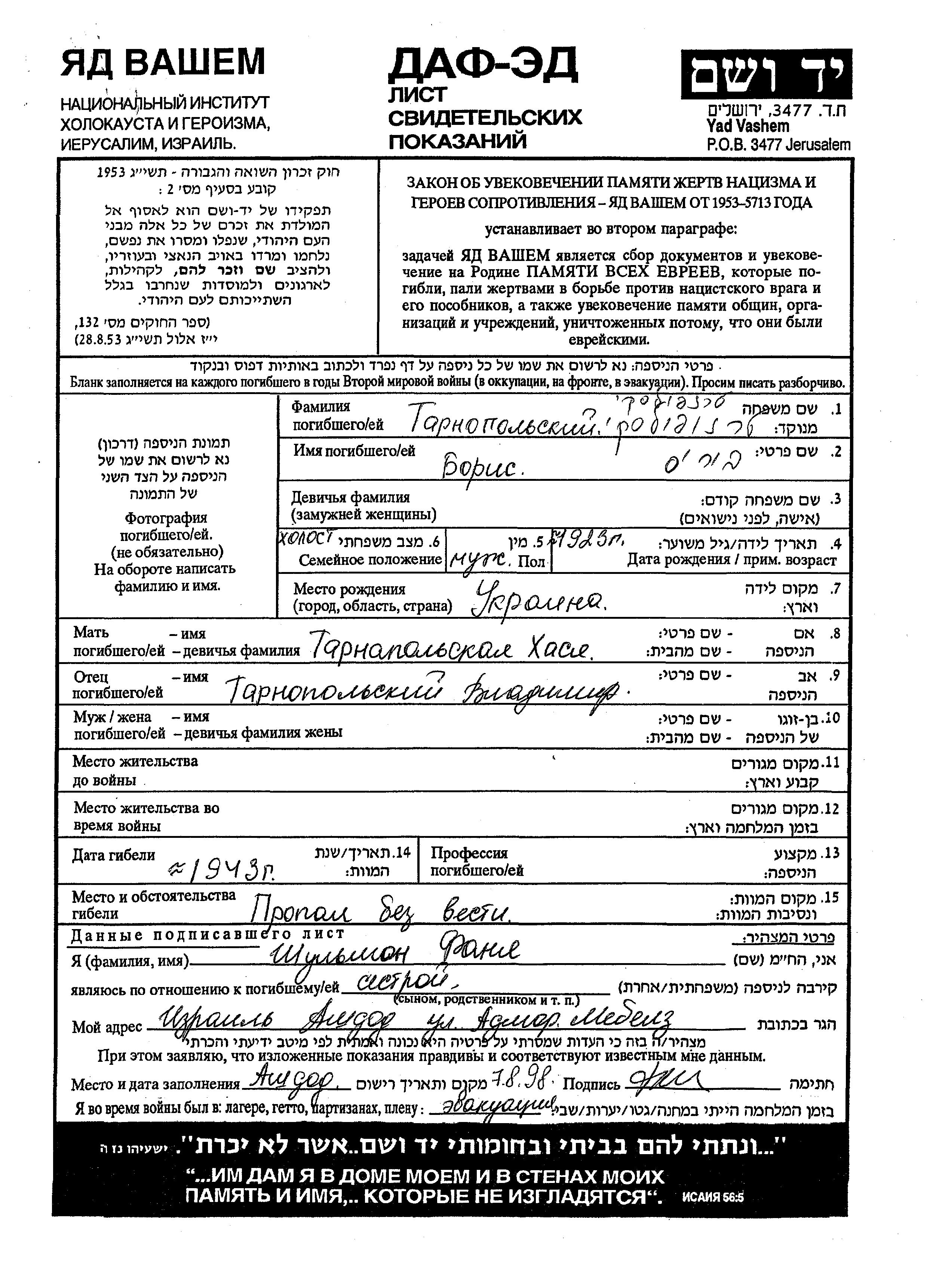 Tarnopolski Boris 1923 unbekannter Ort, Gedenkblatt