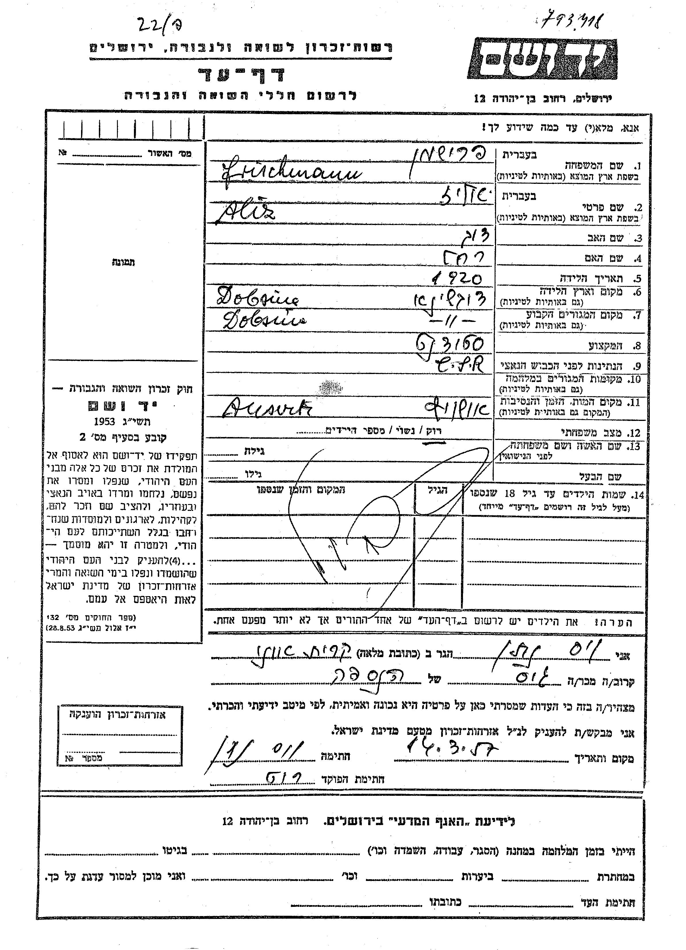 Aliz Elizabeta Frischmann wurde im Jahr 1920 in Dobsina, Tschechoslowakei geboren. Sie war die Tochter von Dov und Rakhel. Sie war Student und Ledig. Vor dem Zweiten Weltkrieg lebte sie in Dobsina, Tschechoslowakei.